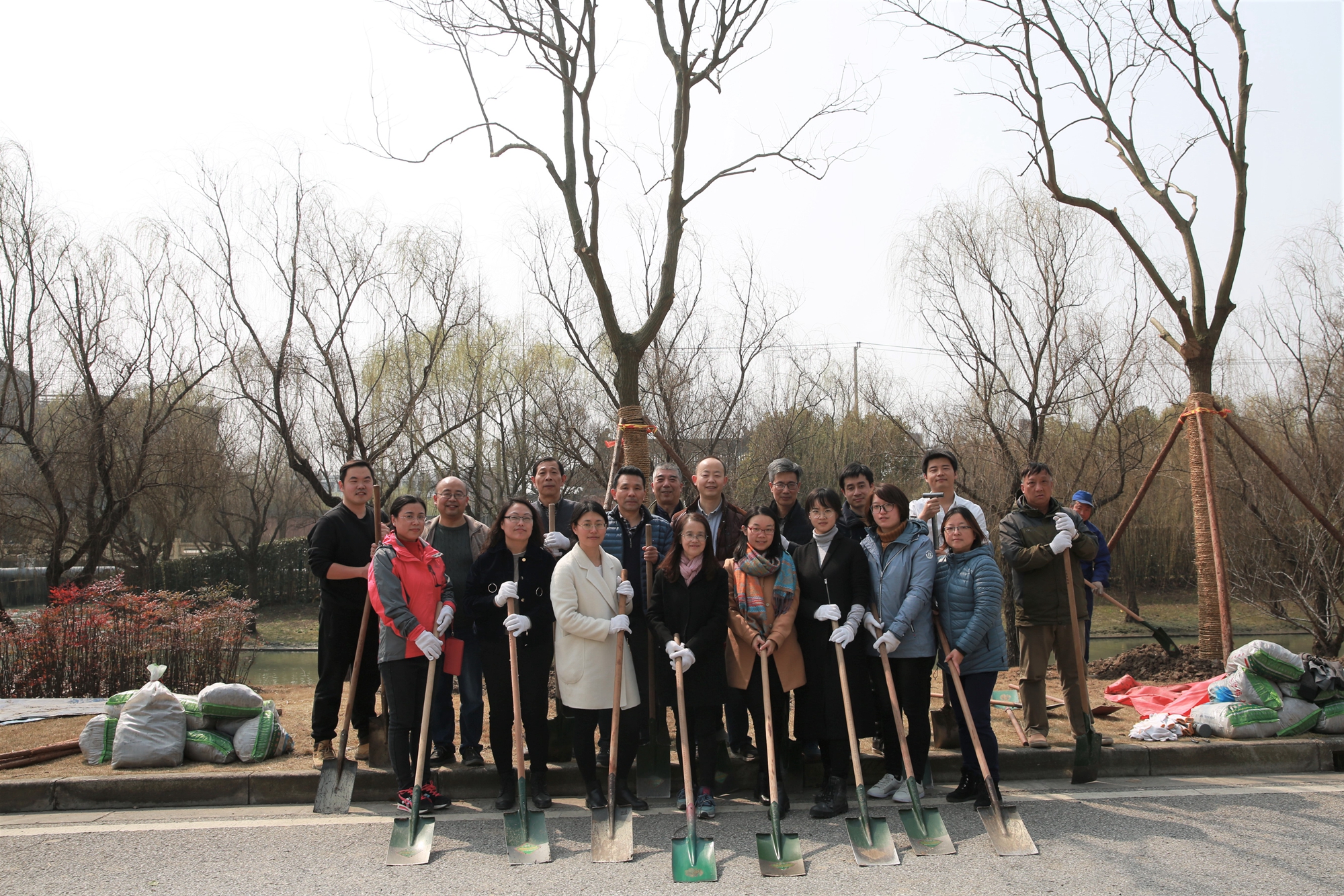 植树点位于樱桃河畔的光华路上,属第三教学楼、第四教学楼绿化范围内。植树现场一片热火朝天景象:师生们一起挥锹铲土填入树坑,培实新土堆起围堰。