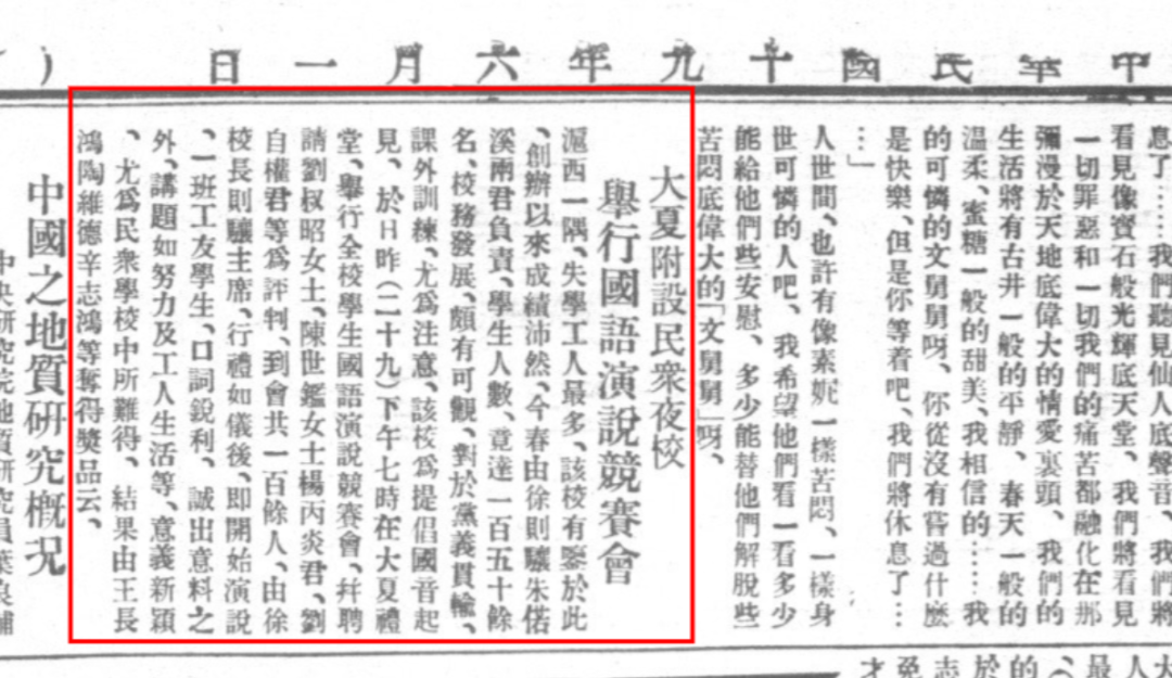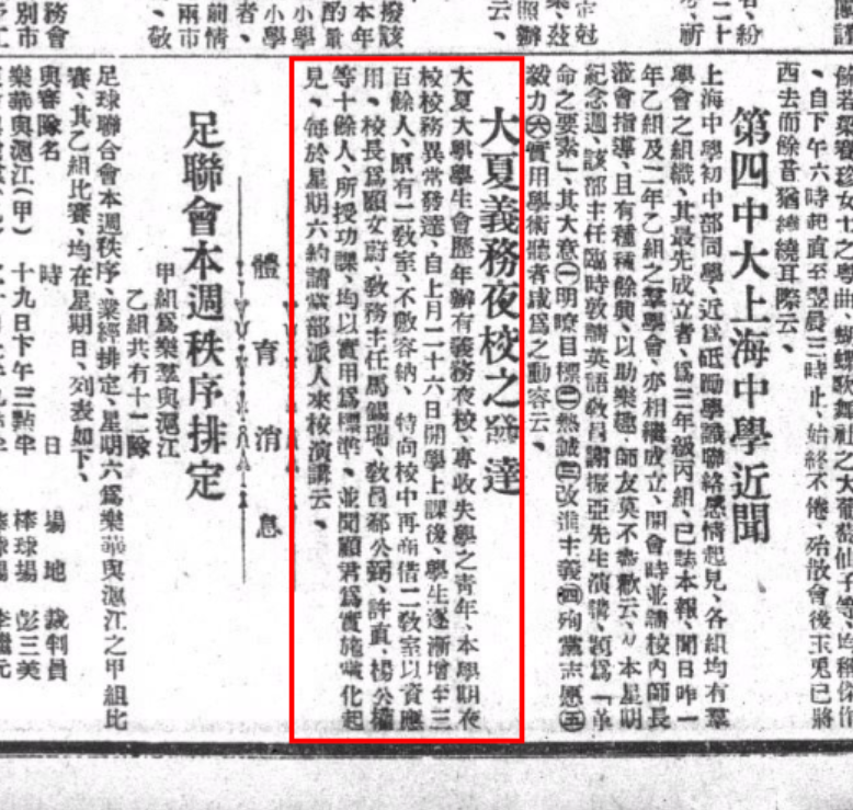 自1924年大夏大学创立以来,考虑沪西一带失学工人众多,即由学生会开设平民夜校,每夜授课两小时,教管有方,创办成绩斐然。至1926年,学生已有百余人。