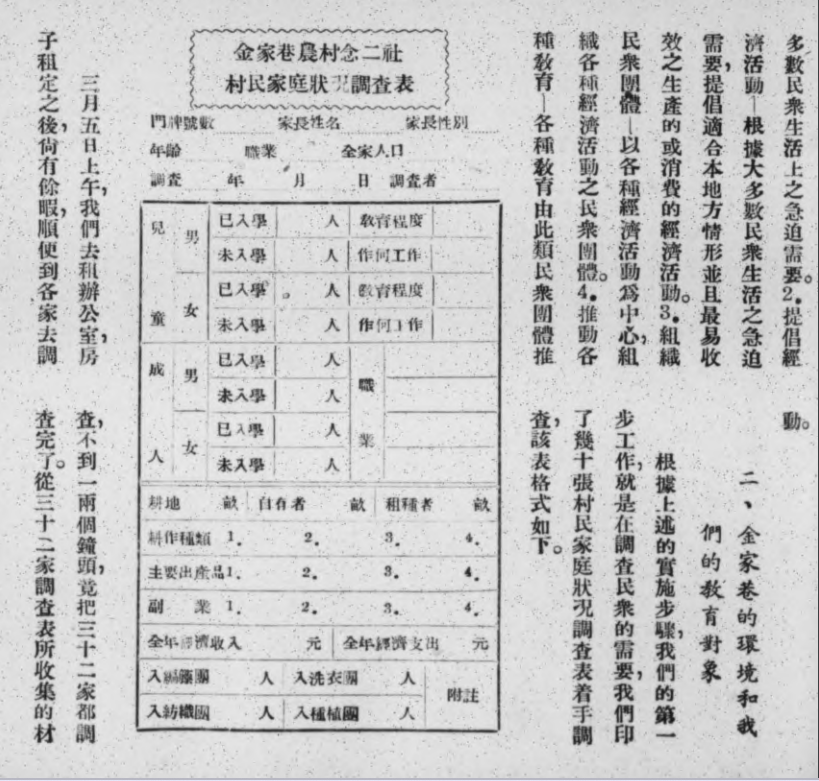 《江苏教育》1934年。1933年,大夏大学教育学院院长邰爽秋创办念二社。图为在沪西金家巷念二社的村民家庭情况调查表。