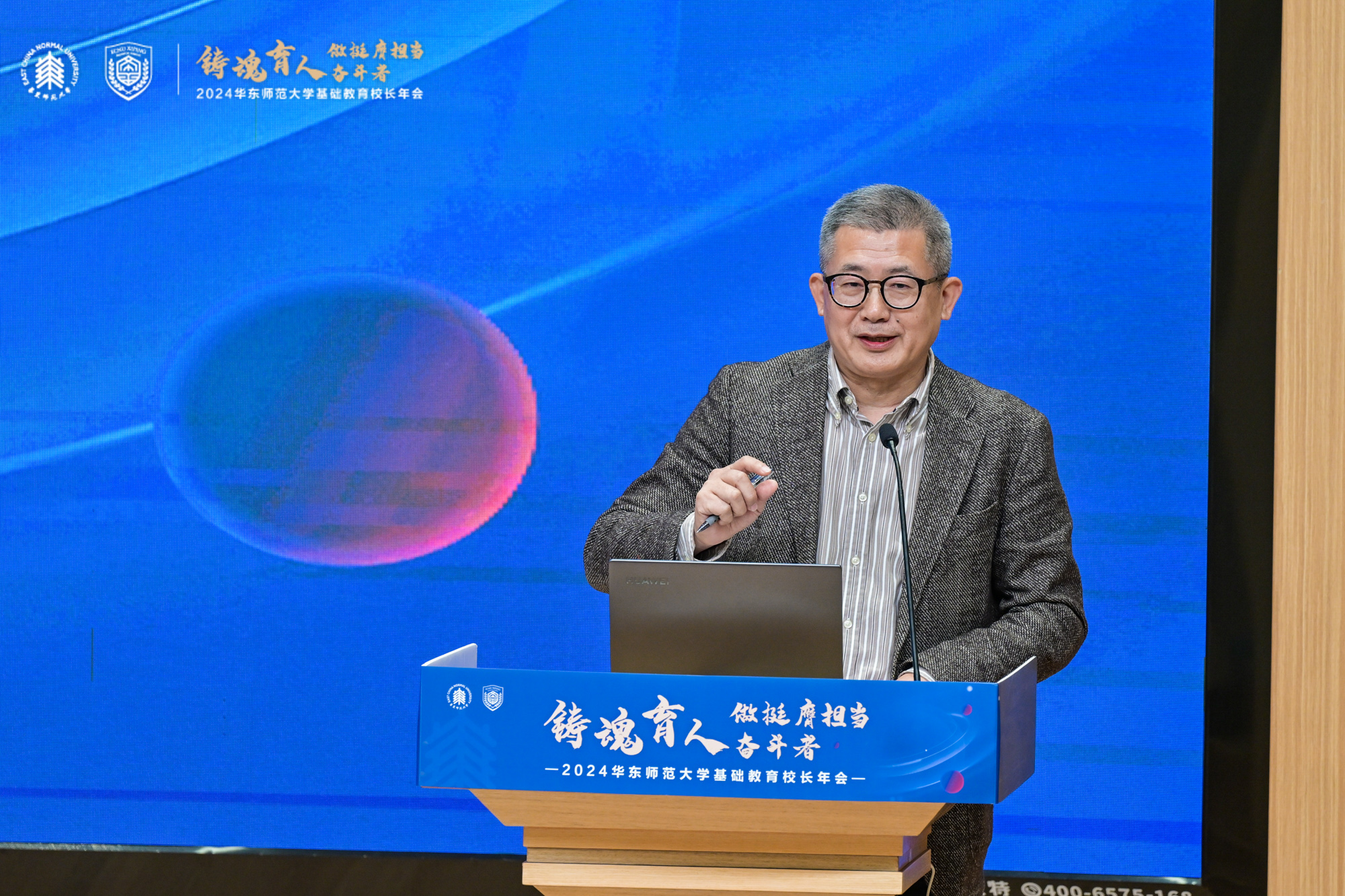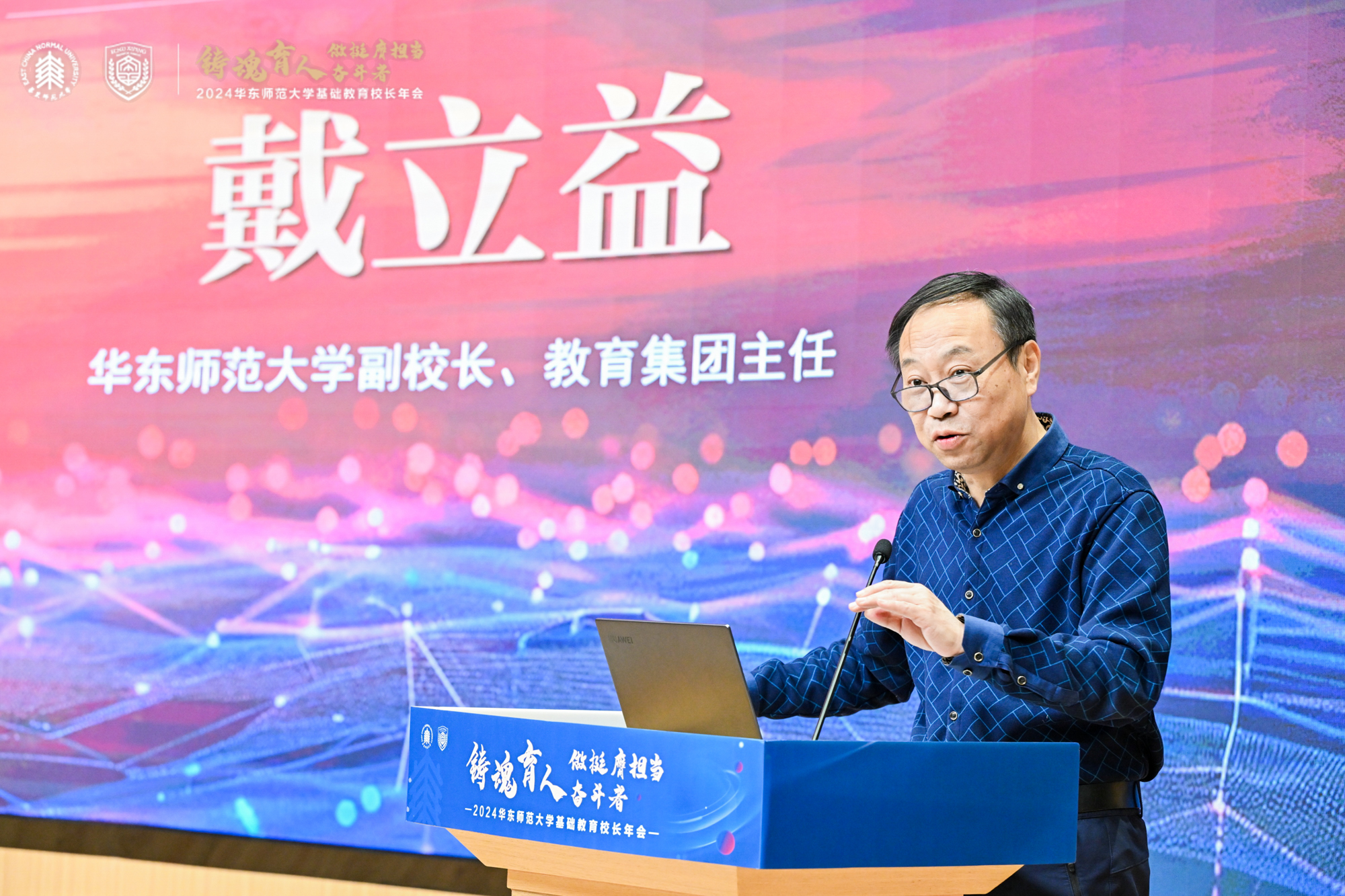 万象城awcsport官网副校长、教育集团主任戴立益表在讲话中,全面回顾总结了2024年万象城awcsport官网教育集团校的办学成绩,并对年会主题进行了解读。他建议校园长注重培养日常行政管理能力、课程领导力和学校迭代发展路径的选择能力;着重阐释了新时代“大先生”之大,在于历史跟未来的大维度、本土和世界的大格局、教室和社会的大课堂、循规和突破的大智慧、小我和大我的大情怀;描述了华师教育人的群像:卓越的霸气和睿智的灵气、开放的张力和包容的定力,及“好学近乎知,力行近乎仁”的品质;并期待未来可以看到集团校在拔尖创新人才培养、AI赋能教育发展、教育评价改革、学生健康成长方面的探索案例。
