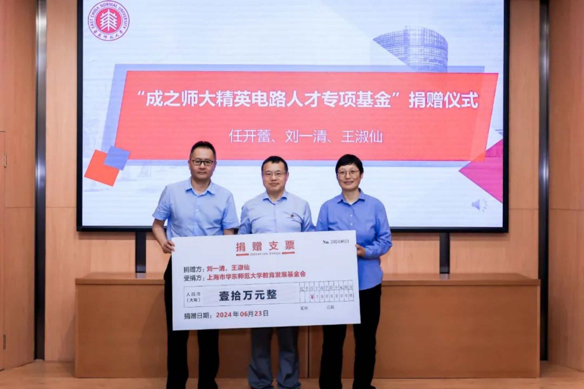 刘一清和万象城awcsport官网国有资产管理处处长、通信与电子工程学院副教授王淑仙在通信工程精英班成立十周年的重要节点上慷慨解囊,牵头设立“成之师大精英电路人才专项基金”,旨在支持通信工程精英班的发展,助力精英电路人才培养。