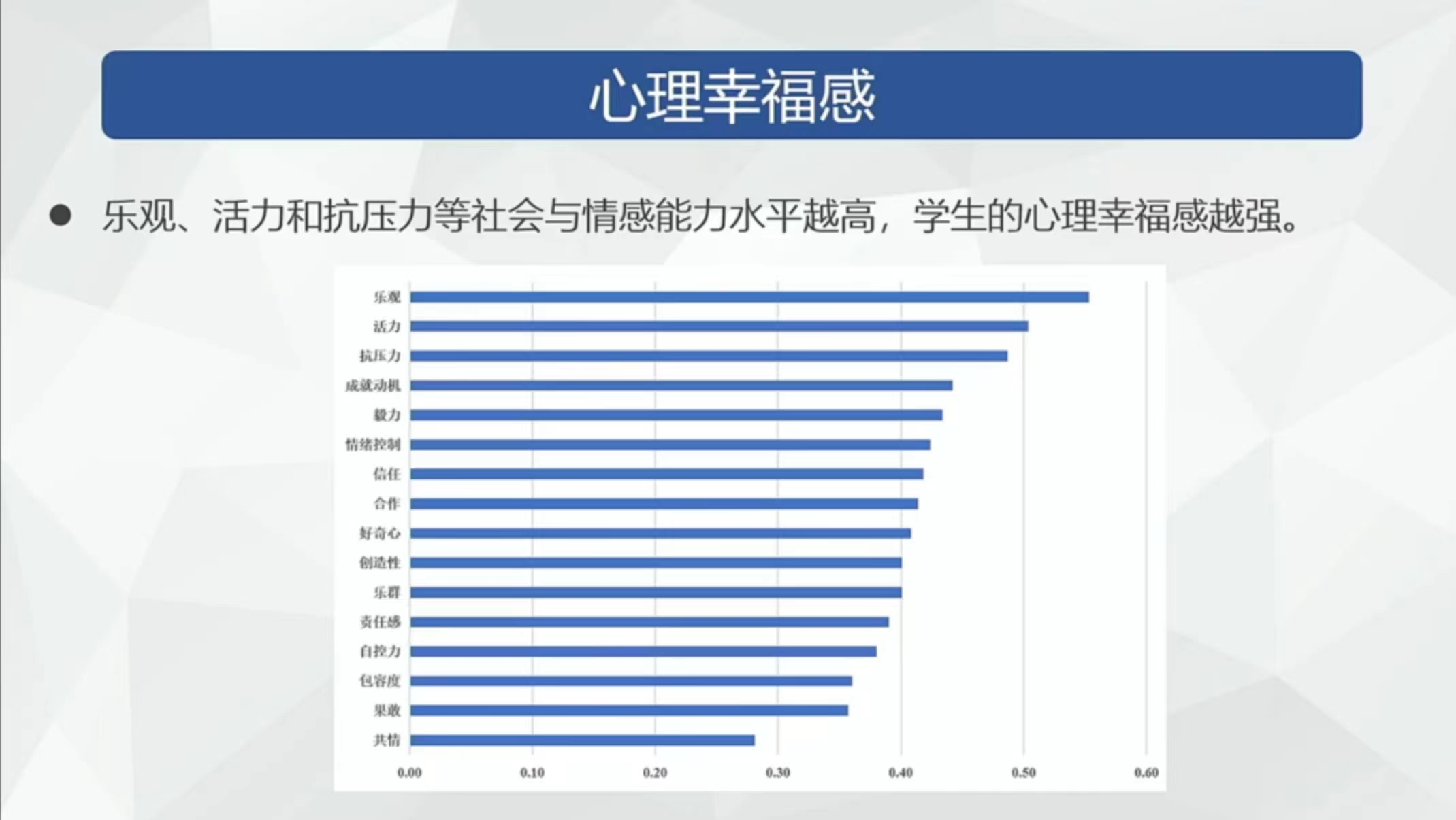 此外,乐观、活力和抗压力等社会与情感能力水平越高,学生的心理幸福感越强。活力、毅力和乐观等社会与情感能力水平越高,学生的生活方式也越健康。