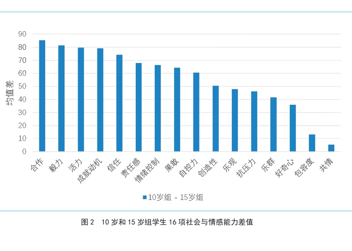 本次测评分为10岁组和15岁组学生。值得注意的是,在全球范围内,10 岁组学生的社会与情感能力得分高于15岁组学生。测评结果显示,10岁组学生在所有16项社会与情感能力中的得分均略高于15岁组学生。其中,合作能力均值变化最大,共情能力均值变化最小。