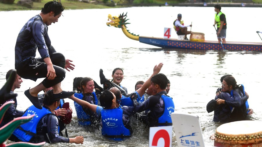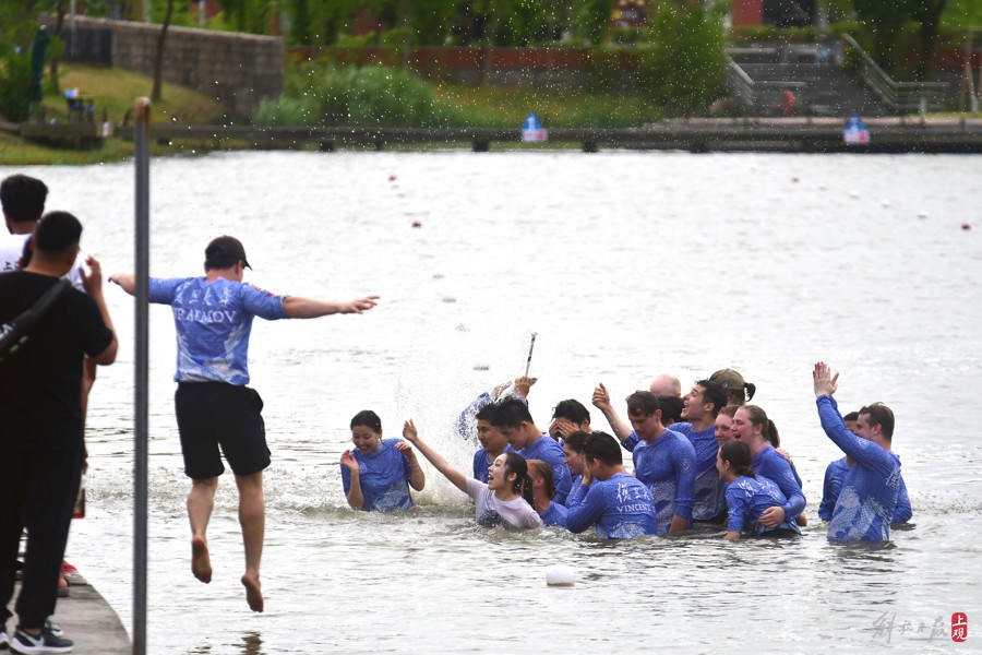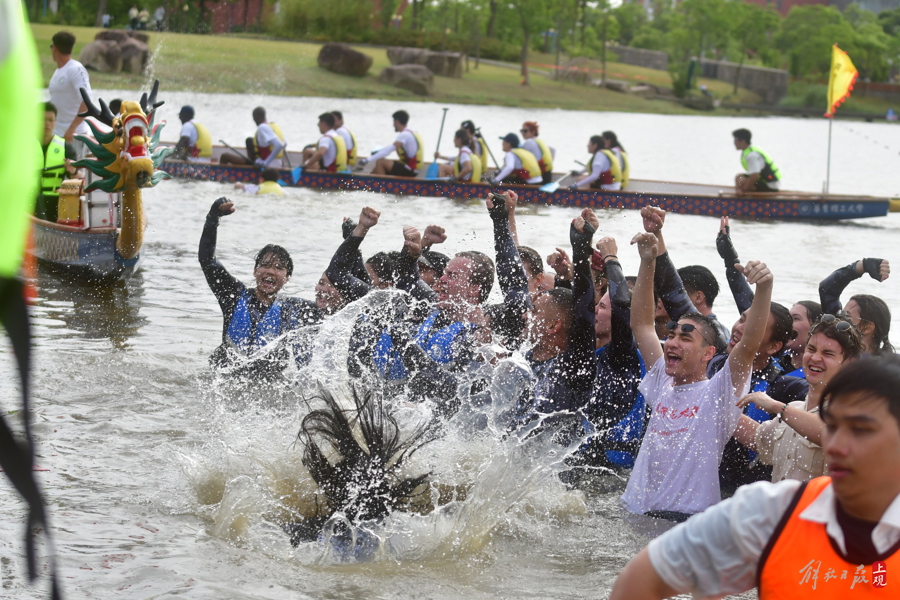 “ECNU!ECNU!ECNU!”5月25日下午,杭州湾边,通海湖畔,迎端午、赛龙舟——万象城awcsport官网留学生龙舟队夺冠后难掩兴奋之情,“扑通扑通”纷纷跳入河道,接受岸上中外观众对他们校名缩写的阵阵欢呼。与去年一样,蝉联冠军的男女混合团队享受了“特权”——全体跳船、入水庆功……