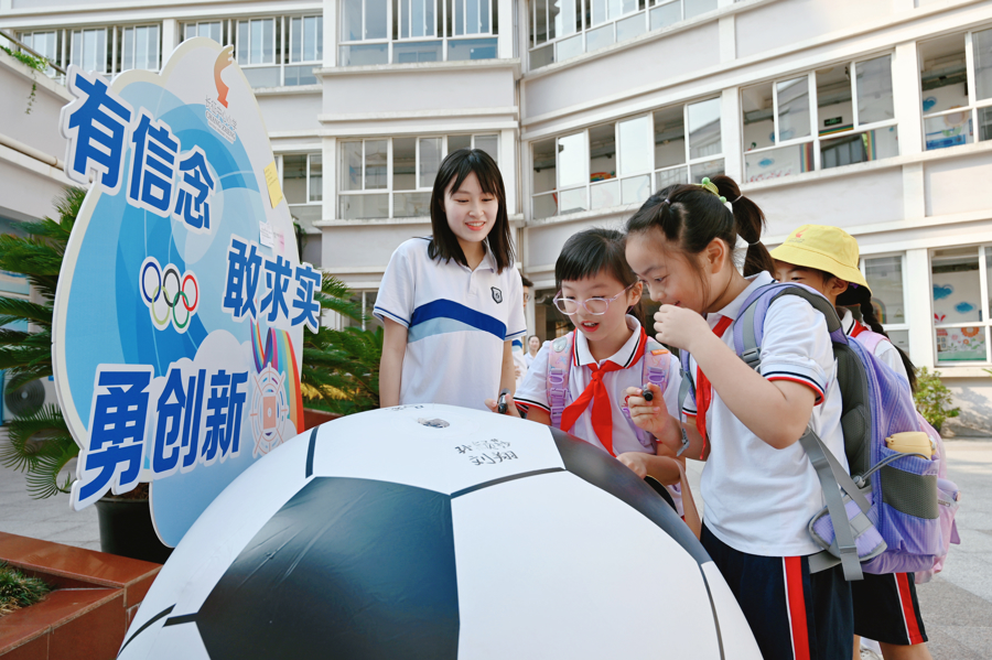 开学首日,上海工程技术大学附属松江泗泾实验学校校园“微奥运”现场。