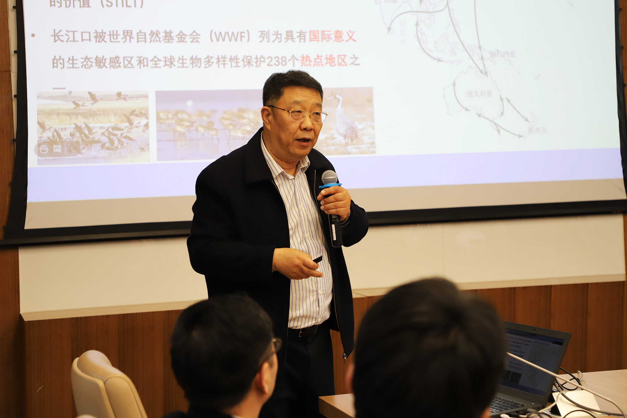 本次研讨会分别由上海市野生动植物保护协会会长裴恩乐和河口海岸学国家重点实验室何青教授主持。华东师大何青教授、包起帆教授、王天厚教授、曾刚教授,复旦大学吴纪华教授,上海环境监测中心徐庆科长,国务院发展研究中心苏杨研究员,南京大学安树青教授,长江勘测规划设计研究院陈前海主任,农村农业部长江流域渔政监督管理办公室吴建平处长,交通运输部长江口航道管理局李文正处长,上海市环境科学研究院王敏高工,东滩自然保护区管理事务中心马强副主任等就“长江口生命共同体构建”专题,分别进行了长江河口潮滩生态系统现状与演变趋势,利用航道疏浚土开展横沙浅滩生态基底塑造,湿地鸟类与栖息地质量及保护,长江经济带生态保护与长三角一体化发展,湿地水生生物多样性及其维持机制,河口水、土、气和环境质量评估,长江口综合整治规划,长江口国家公园规划研究,上海市湿地保护规划,禁捕管理协调机制,航道建设和发展,生态保护红线划定及管控及崇明东滩互花米草综合治理等主题的报告进行交流。研讨思考涉及国家、长三角、上海市等多层面战略,研讨内容呈现多学科交叉,研讨问题涵盖水利、航运、生态、环保、城市管理等多领域。