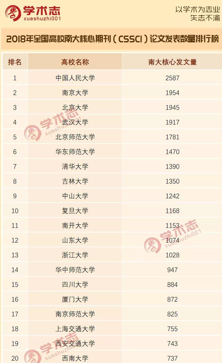 2018年全国高校南大核心(CSSCI)论文发表数量排行榜统计数据来自《中国高校科研成果统计分析数据库》,由中国科学文献计量评价研究中心发布。排行榜中高校共发表了78661篇南大核心期刊论文,前10名高校共发表16804篇南大核心期刊论文,占总体论文总数的21.3%。我校以1470篇的发文量居榜单第6位,位列上海高校第一。