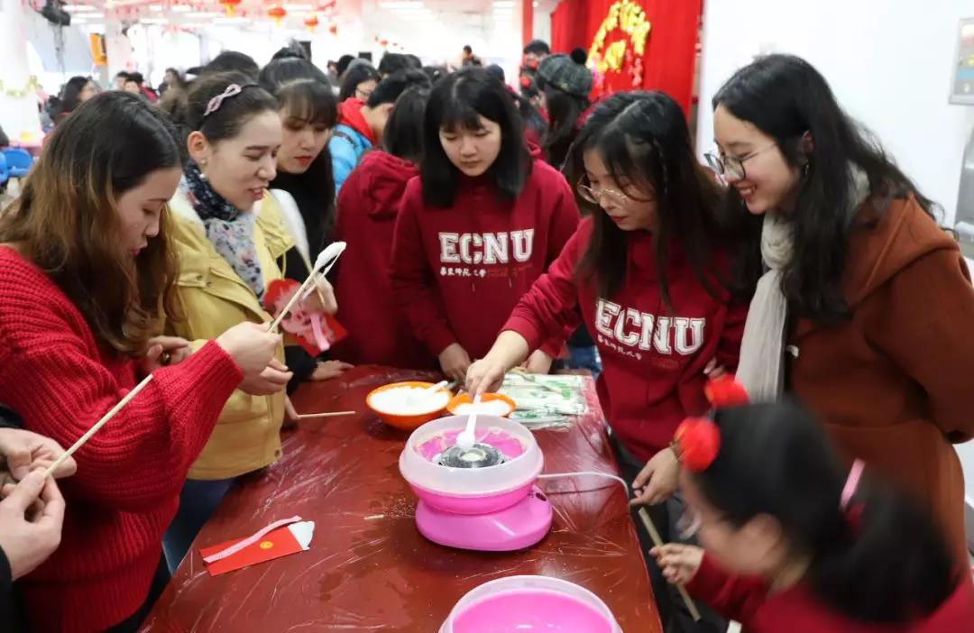 1月30日是农历腊月二十五,一年一度的迎新春师生同乐会在师生们的翘首以盼中到来,经过精心的装饰,闵行校区华闵餐厅一楼喜气洋洋,年味十足。当天,寒假留校的中外学生与学校领导、教职员工欢聚一堂,喜迎猪年春节。当天下午,游园会活动首先在华闵餐厅内火热开场。与“小猪佩奇”的亲密合影,与新春灯谜的头脑交锋,与棉花糖的甜蜜邂逅,与玻璃宝“猪”的斗智斗勇……一个又一个热闹的游园活动不仅为同乐会做了充分预热,更让同学们在欢乐的互动游戏中感受到了学校大家庭热烈的过年气氛。