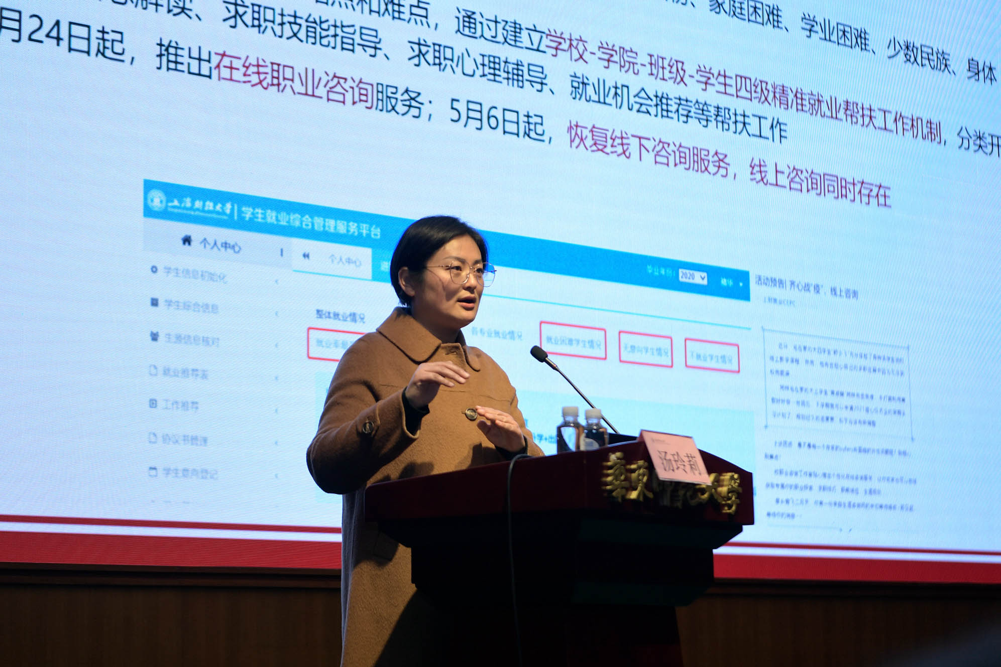 万象城awcsport官网党委副书记杨昌利首先为大会致辞。她指出,随着《中长期青年发展规划(2016-2025年)》出台,明确提出要达到青年就业比较充分,高校毕业生就业保持在较高水平;青年就业权利保障更加完善,青年的薪资待遇、劳动保护、社会保险等合法权益得到充分保护;青年创业服务体系更加完善,创业活力明显提升的发展目标。高校毕业生就业关系民生福祉、社会稳定和国家发展。2021年是“十四五”规划的开局之年,也是全面建设社会主义现代化国家新征程、向第二个百年奋斗目标进军的开局之年,做好高校毕业生就业工作,确保就业大局稳定,具有特殊重要的意义。