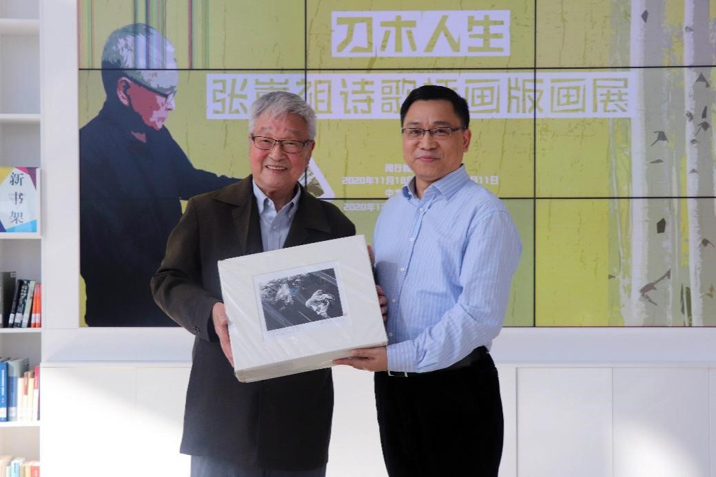 开幕式上,张嵩祖教授分别向校档案馆、图书馆各捐赠了一套《长歌和短歌》诗集插画版画。档案馆馆长汤涛向张嵩祖颁发捐赠证书。图书馆馆长胡晓明向张嵩祖颁发赠书荣誉证书,并回赠图书馆馆藏精品文创《御制耕织图》。