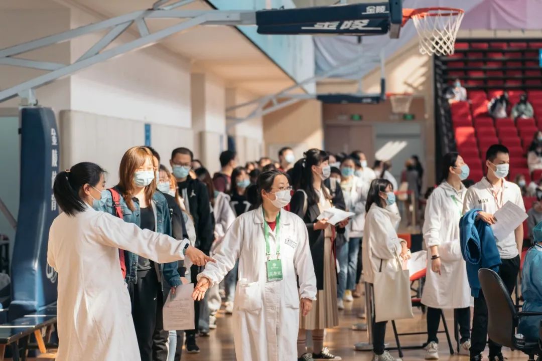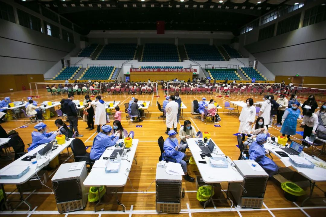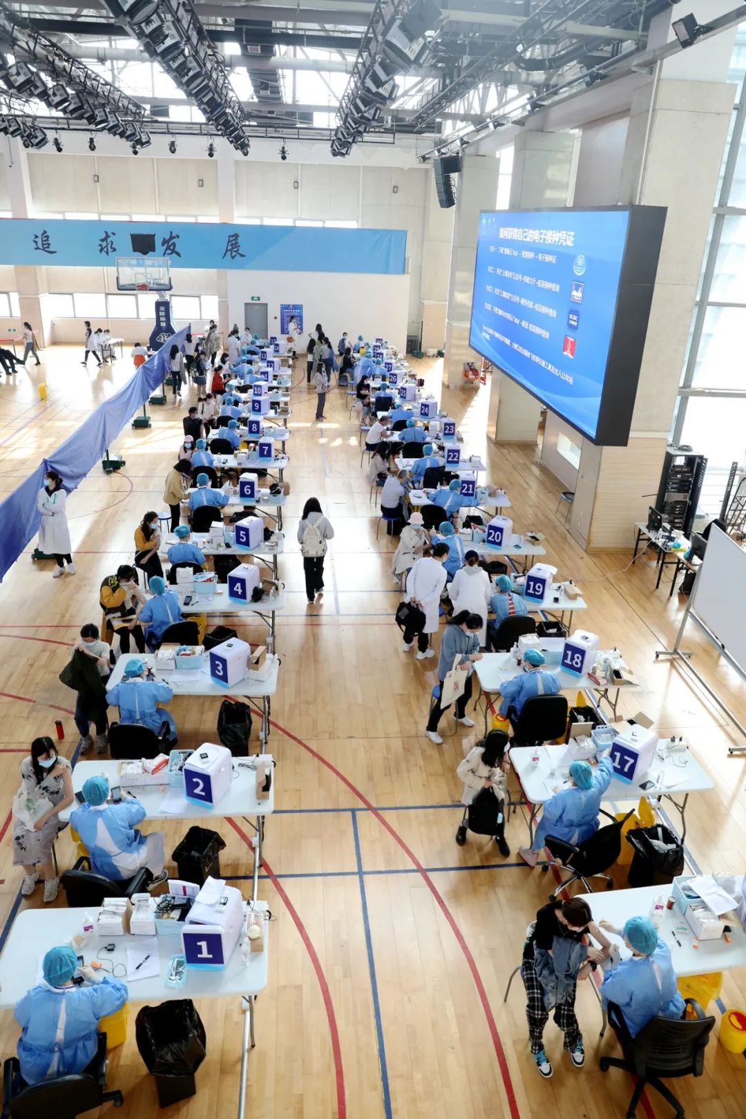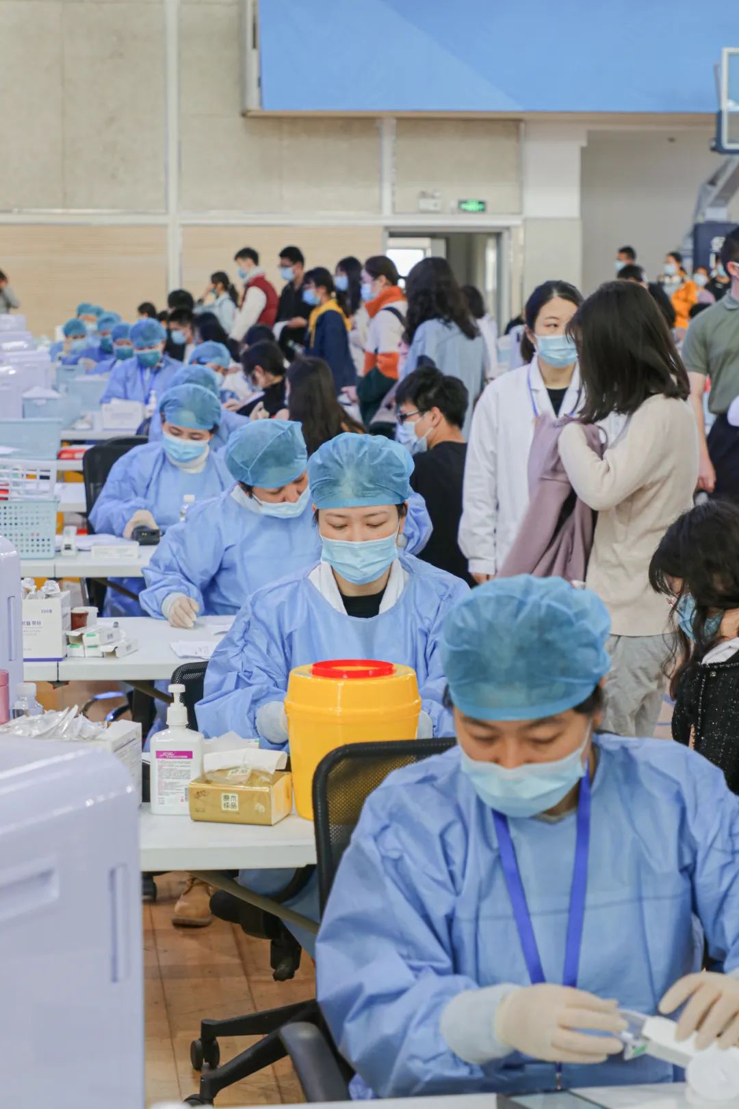 3月27-28日,约18000名学生及教职员工分校区、按时段在两校区体育馆接种了新冠疫苗分别由闵行区、普陀区医护人员组成的临时接种组“上门接种”。