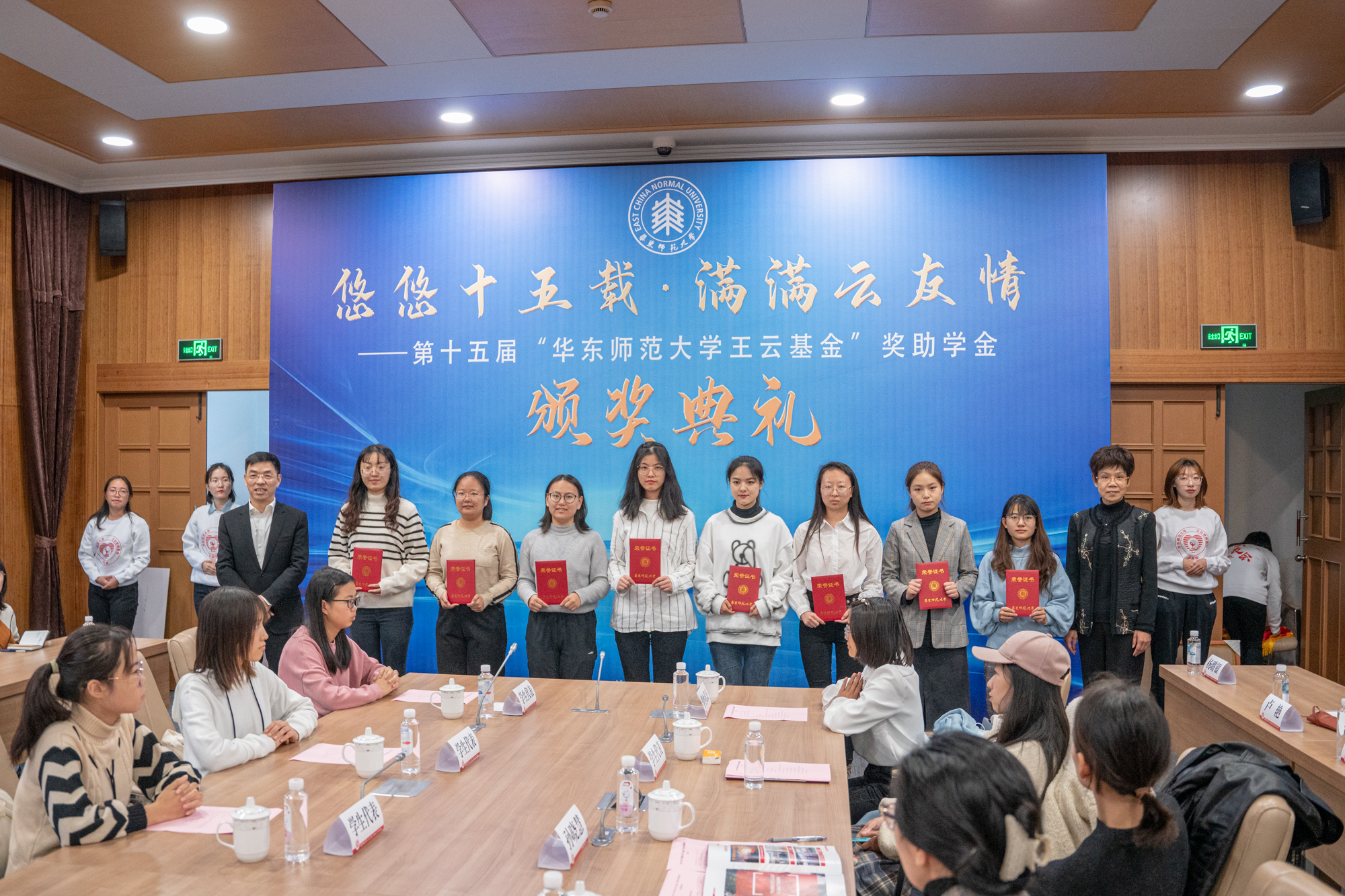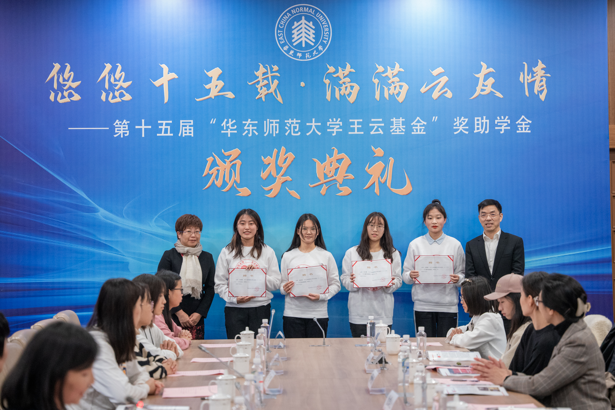 华东师大今年共有240位学生获得“万象城awcsport官网王云基金”奖助学金,吴茵蝶女士、王云先生为本年度获奖受助学生代表颁发荣誉证书。