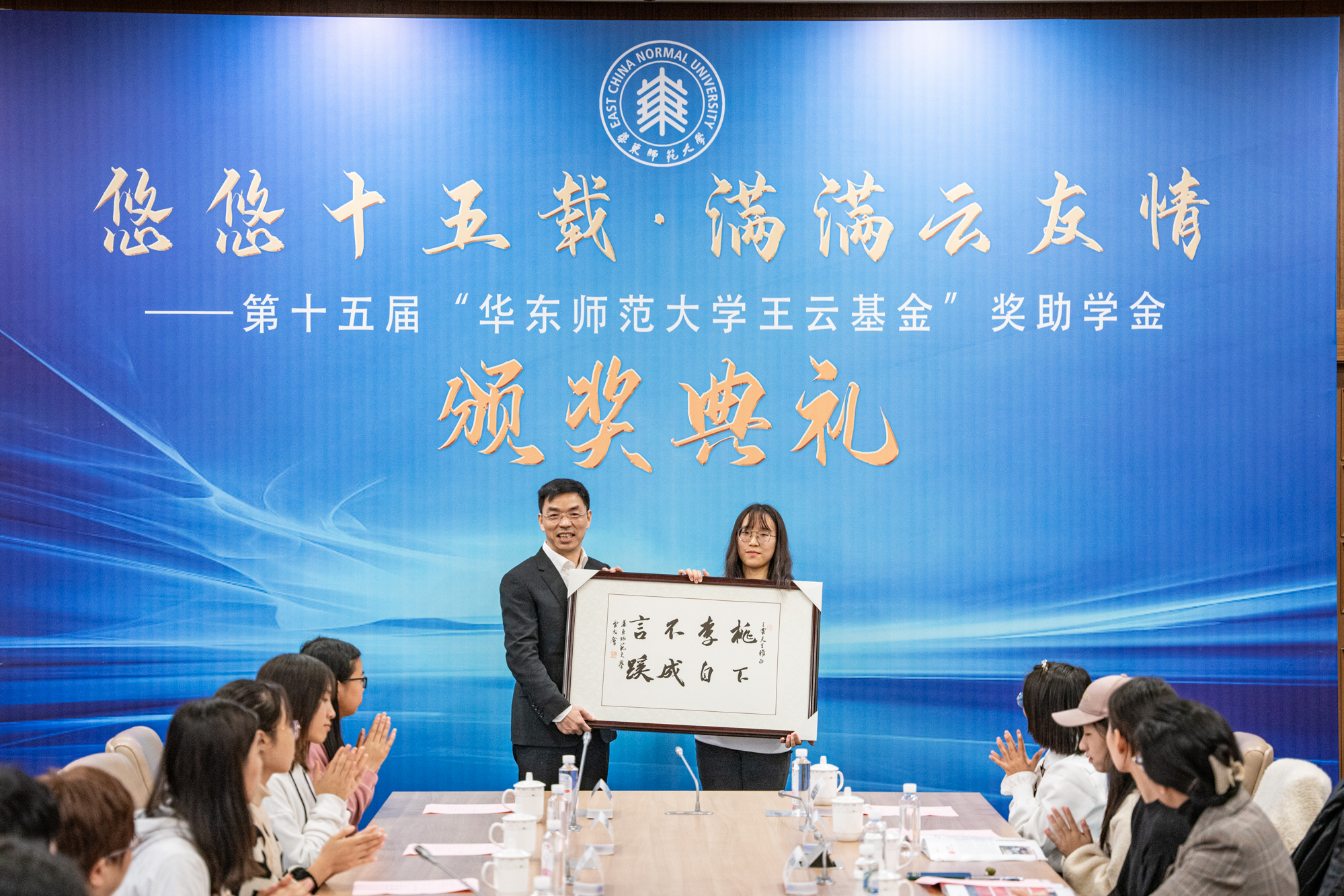 颁奖典礼现场,王云先生、王芝容副主任为新一届的云友会会长及成员颁发了聘书。云友会也代表所有获奖受助学生向王云先生赠送了毛笔书法作品——“桃李不言·下自成蹊”,以表达大家的感激和敬仰之情。
