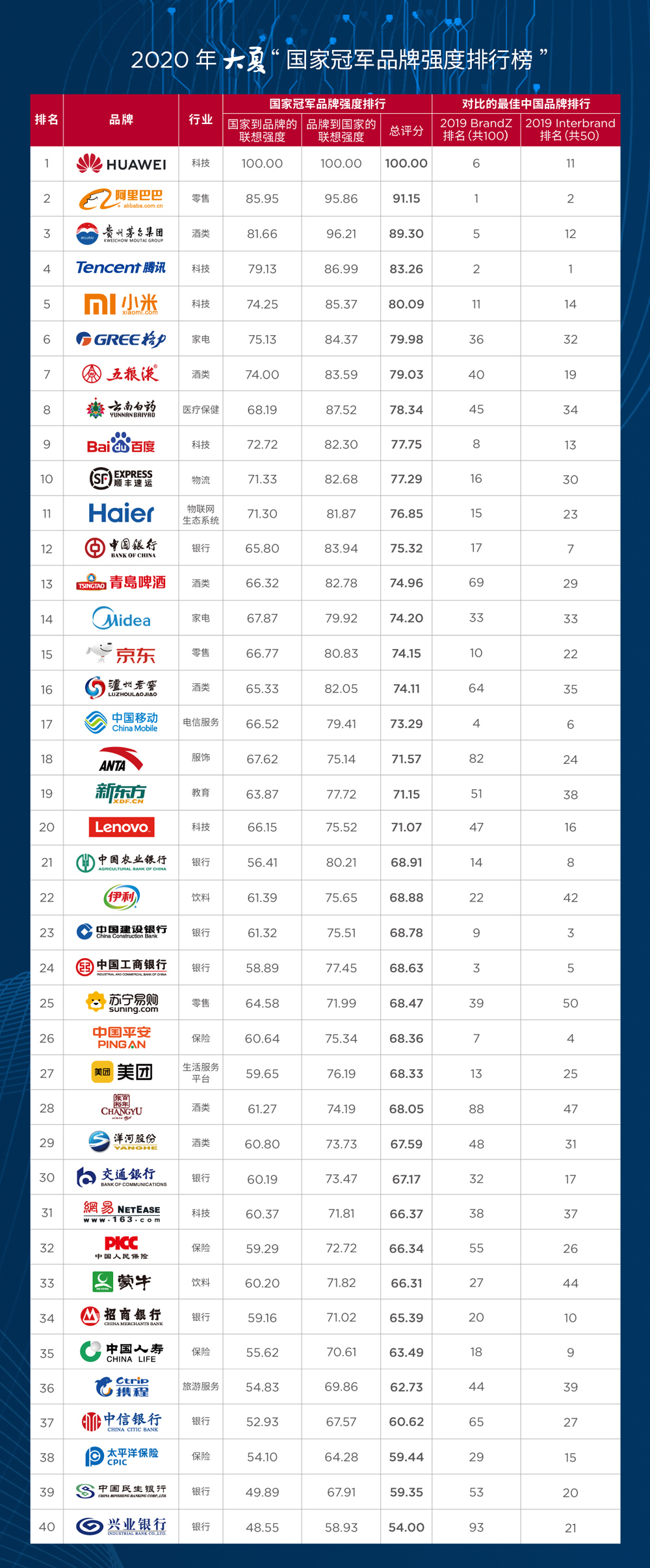 在论坛上,国家品牌战略研究中心正式发布2020年大夏“国家冠军品牌强度排行榜”①。该排行榜是最佳品牌“榜上榜”,即在Interbrand和BrandZ两大著名品牌榜的基础上,对共同进入其2019年“中国最佳品牌榜”的40大品牌,采用独创的“品牌与国家的联结”新构念及测量方法②,通过全国范围内大样本调查,得到“国家冠军品牌强度排行”结果③。它们反映了消费者心目中“品牌”对“中国”的代表性及“品牌”与“中国”产生关联性的程度。它由两个维度的评价指标合成:从中国联想到品牌的强度;从品牌联想到中国的强度。两维度的方差总解释率为75.65%。