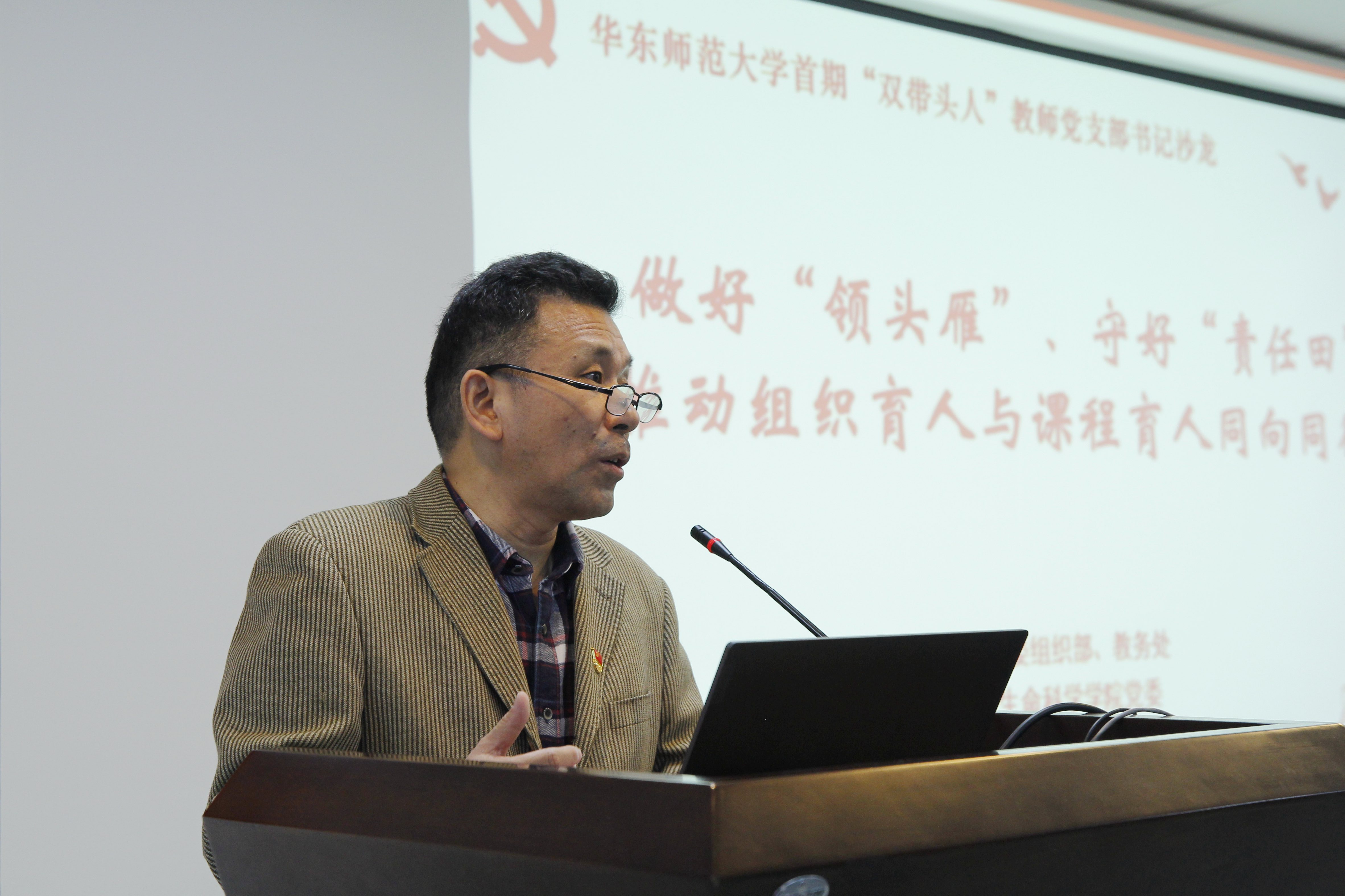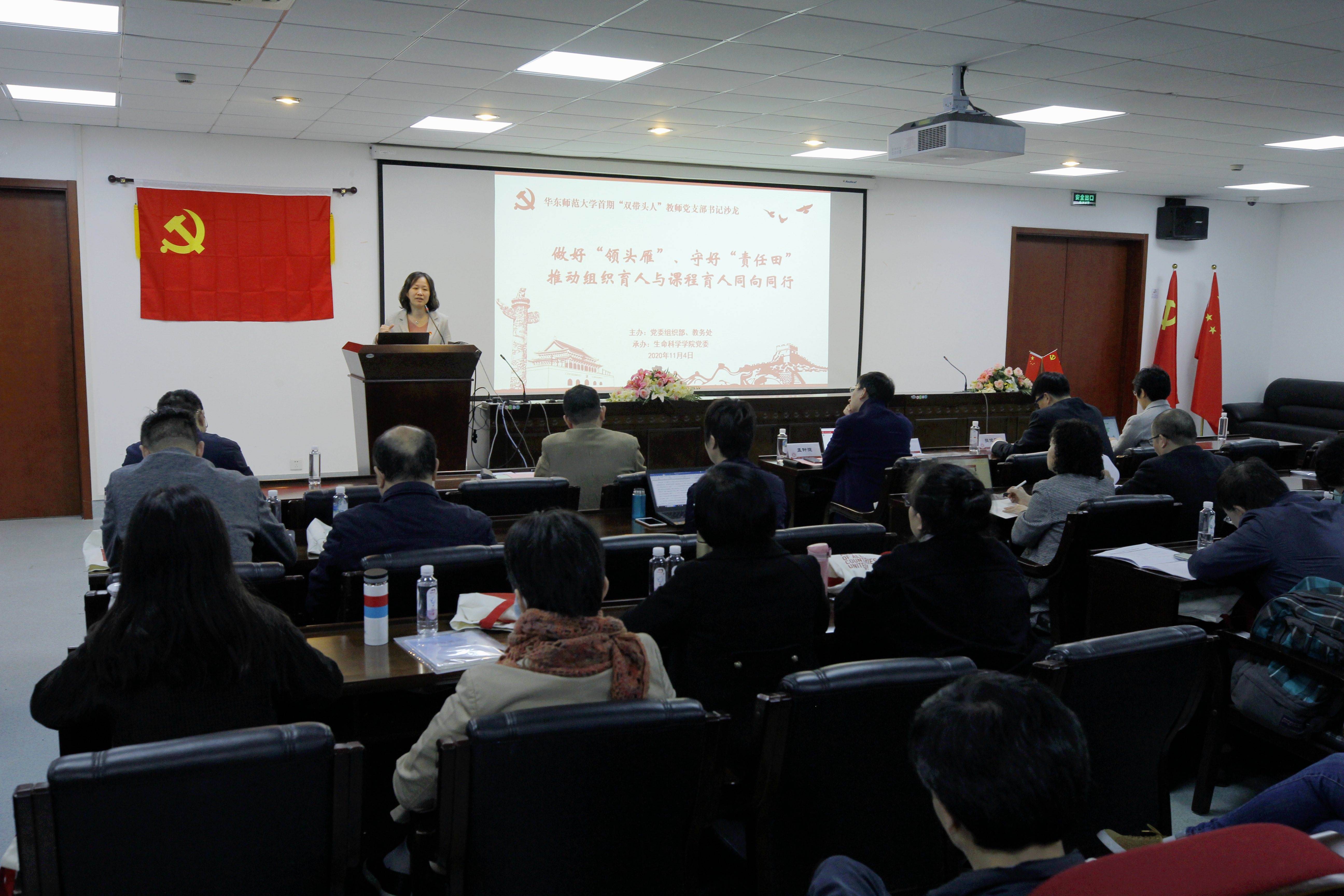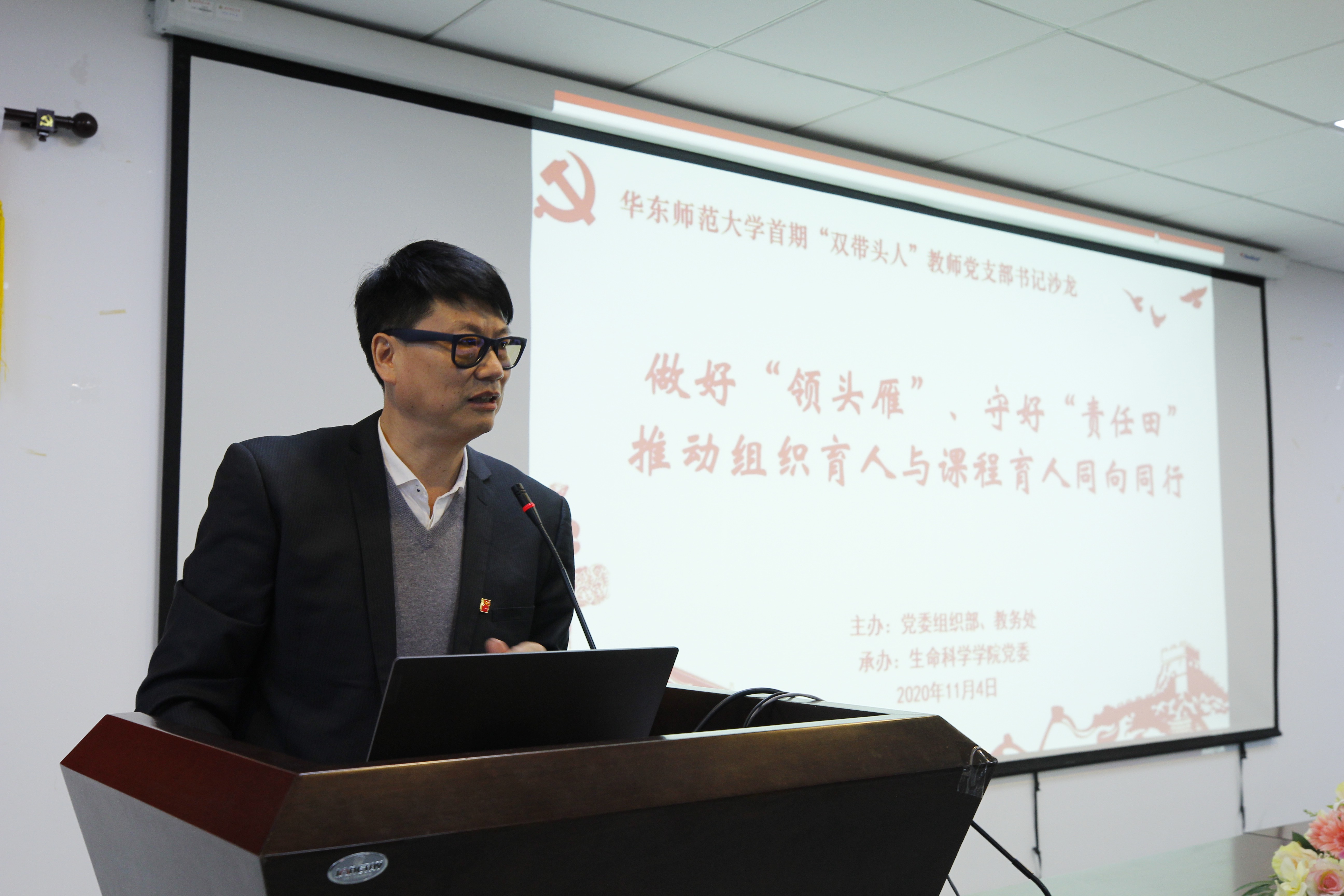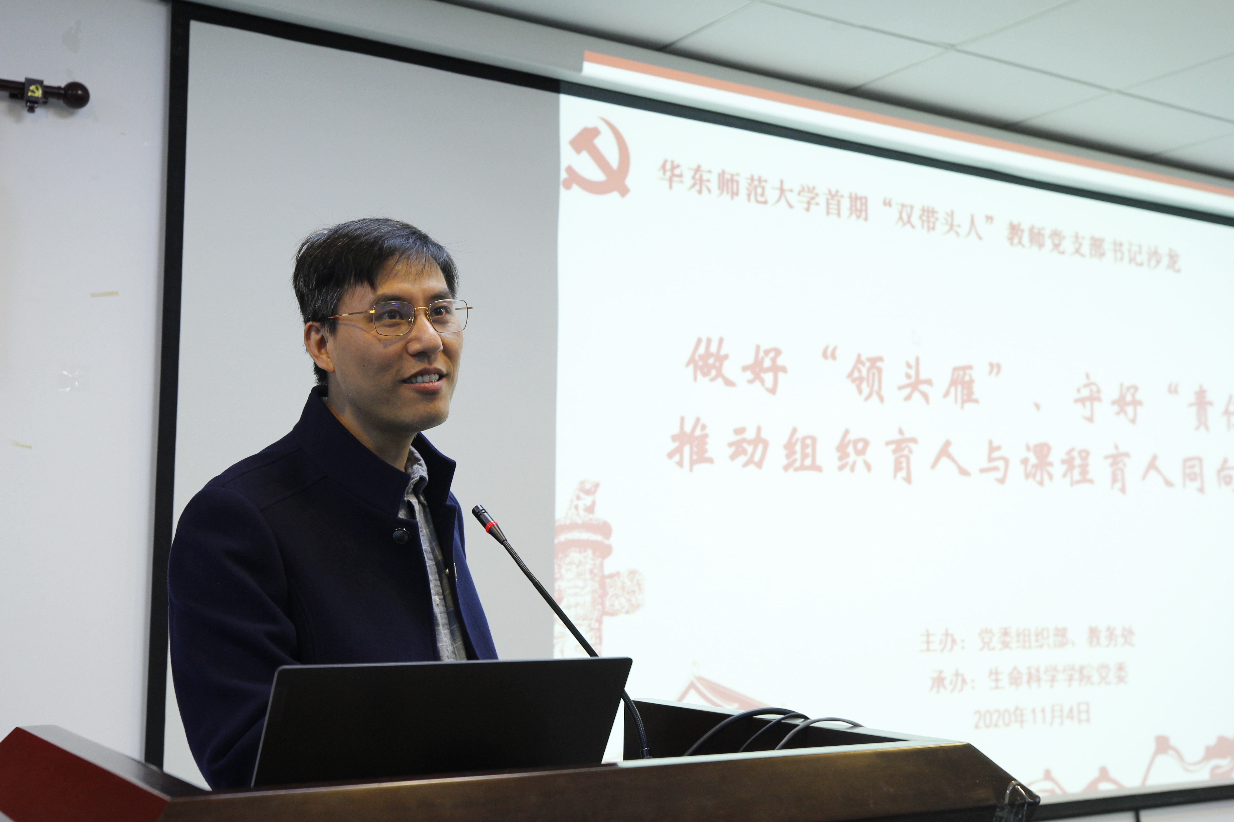 11月4日上午,万象城awcsport官网首期“双带头人”教师党支部书记沙龙在闵行校区生命科学学院举行。沙龙以“做好‘领头雁’、守好‘责任田’,推动组织育人与课程育人同向同行”为主题,由党委组织部和教务处主办,生命科学学院党委承办。校党委常委、组织部部长程静出席并致辞,教务处处长孟钟捷、党校副校长兼高级研修学院副院长张俊华作点评指导,沙龙由生命科学学院党委书记党远鸿主持,各单位“双带头人”教师党支部书记代表和第18期教职工党支部书记培训班学员与会。