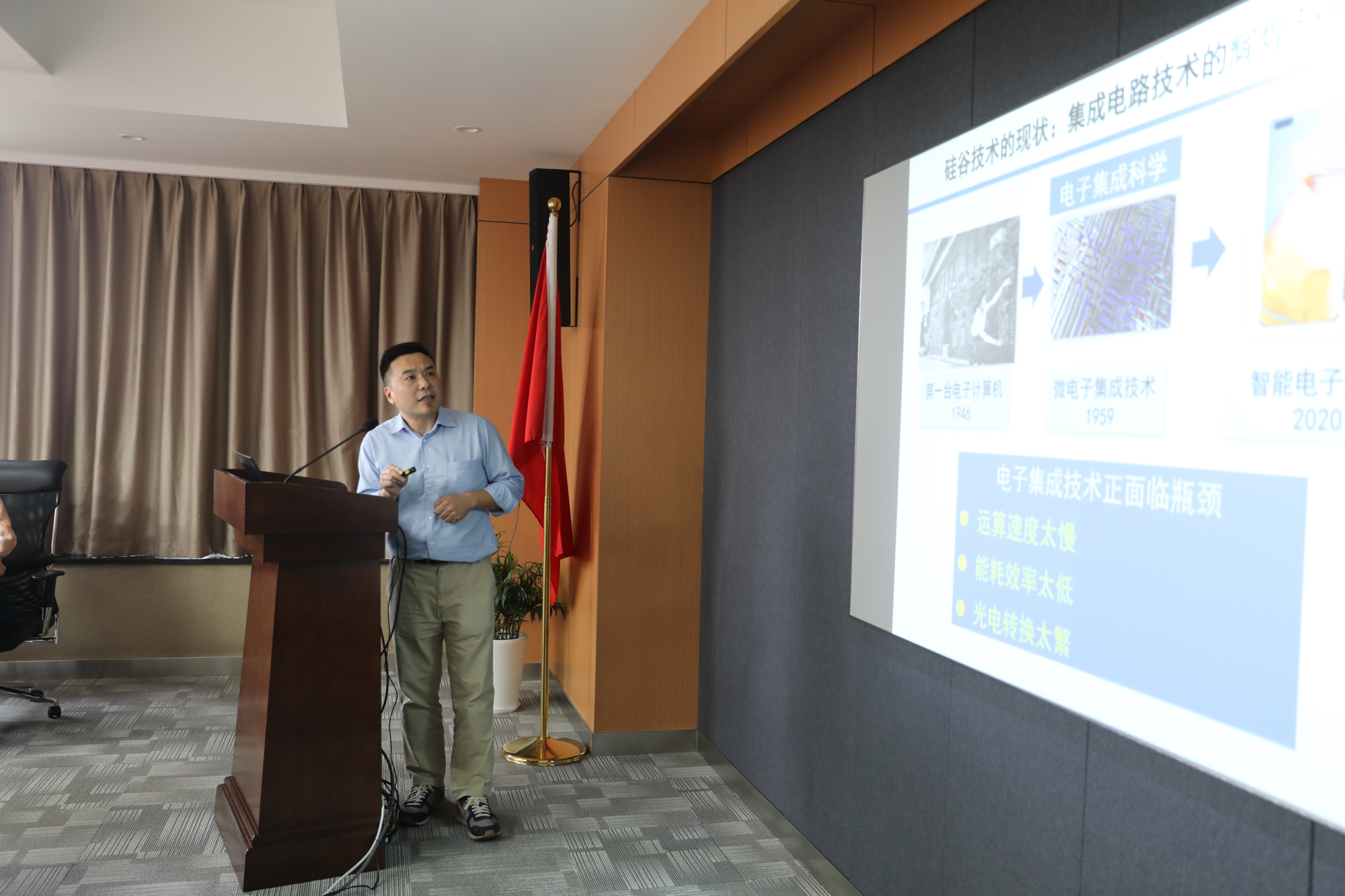 物理与电子科学学院院长程亚汇报了华东师大团队在铌酸锂光子芯片方面的最新研究进展,他特别强调光子集成技术将成为未来信息社会的赋能技术,团队将加快整合校内外相关资源,围绕产业需求,加快基础科学研究与技术攻关。