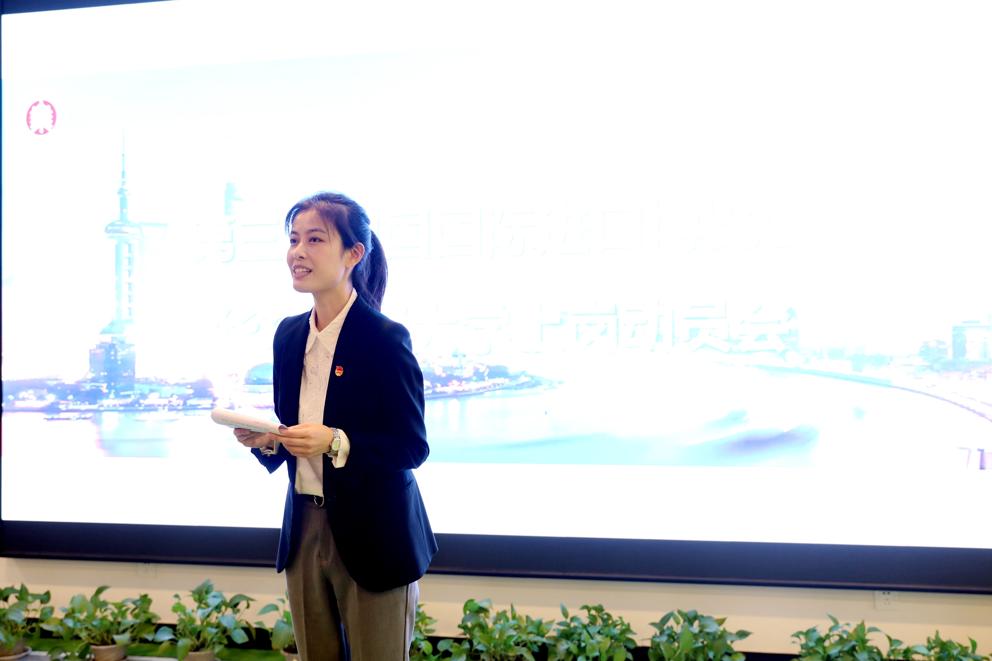 梅兵代表学校表达了对各位“小叶子”辛勤付出的感谢。她表示,今年的进博会能够在11月5日至10日如期举办,一方面说明我国疫情得到了很好的控制,另一方面显示了我国积极构建和完善开放合作、互利共赢全球贸易体系的决心。师大的“小叶子”能够参与到这届进博会中来,既是一次极大的挑战,更是历练自己和奉献社会的一次宝贵机遇。希望各位志愿者在接下来的工作中遵守相关规章制度,怀揣使命与担当,继续努力。面对疫情还会继续存在的形势,作为最特殊的一届志愿者,“小叶子”从某种意义上来说也是“最美逆行者”。学校也会做好支持与保障工作,为每一位同学提供庇护。全校师生都盼望着大家圆满完成志愿服务,平安归来!