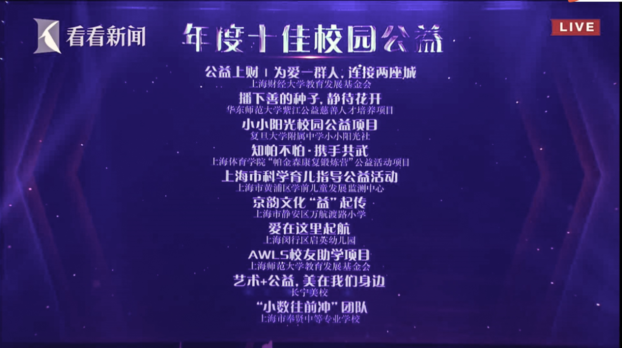 9月26日,由上海市民政局(市社会组织管理局)、上海广播电视台指导,上海公益新媒体中心与上海广播电视台融媒体中心、东方广播中心等共同主办的2020“公益盛典”举行。华东师大教育发展基金会“紫江公益慈善人才培养项目”获评本年度公益之申“年度十佳校园公益”。