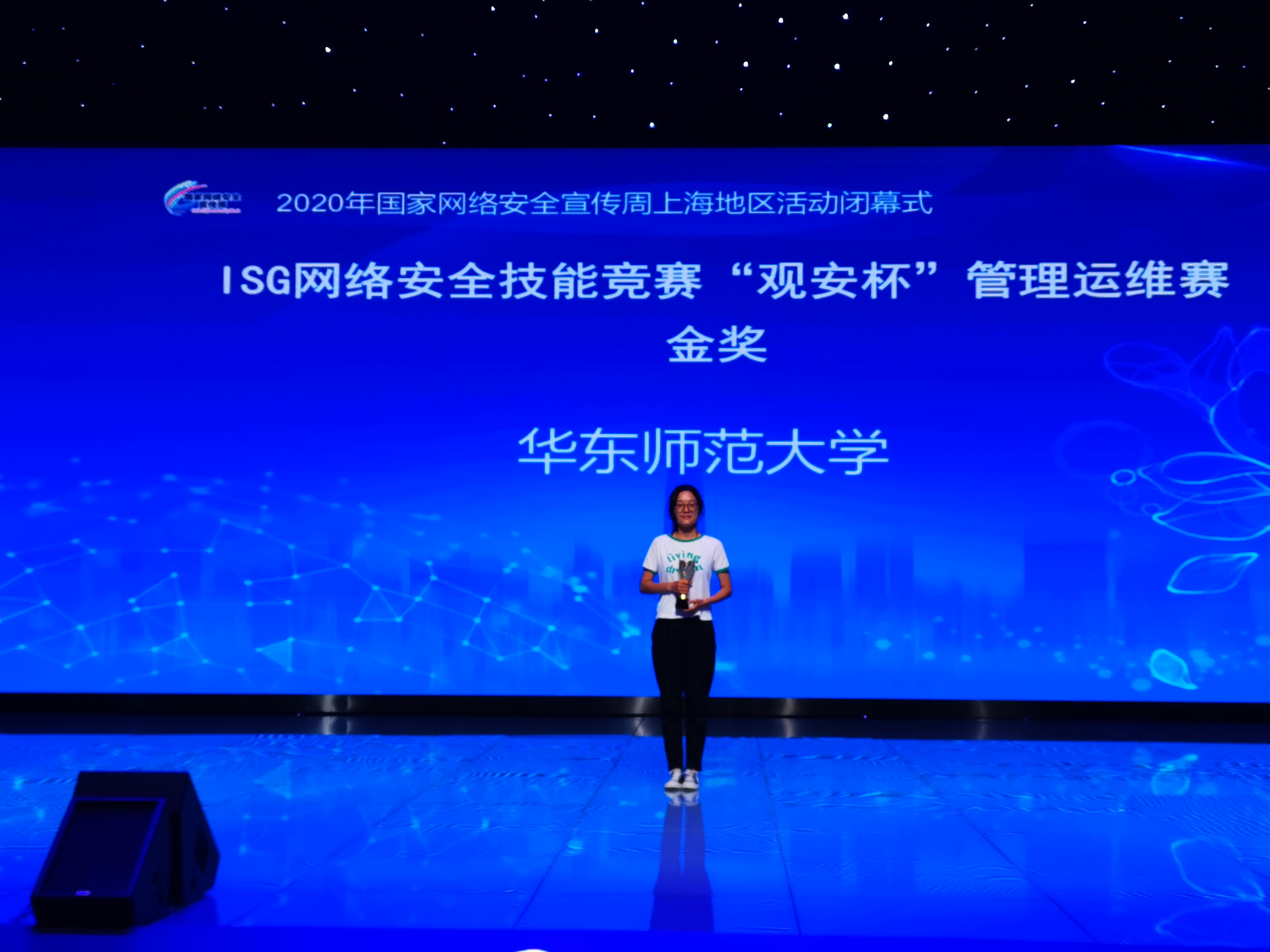 本次国家网络安全宣传周期间,华东师大在网络安全和网络文化建设方面也取得了丰硕成果。在今年9月举办的上海ISG网络安全技能竞赛“观安杯”管理运维赛上,由华东师大信息化治理办公室田玉丹、马帅领组成的“安全先行组”团队以教育领域初赛第一名的成绩进军总决赛,最终在来自十个行业的百余名参赛者中脱颖而出,荣获大赛唯一金奖。