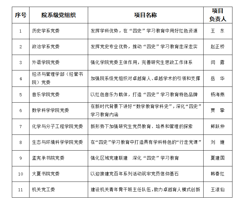 经评审,《发挥学科优势,在“四史”学习教育中用好红色资源》等11个项目被确定为2020-2021学年校“党建工作创新创优”重点项目。
