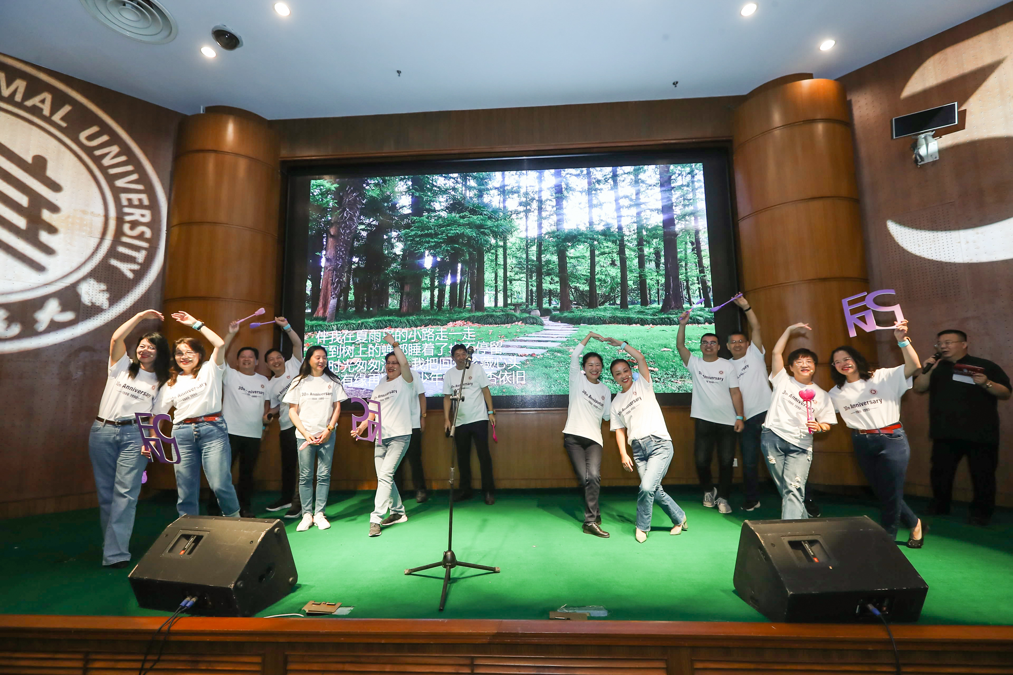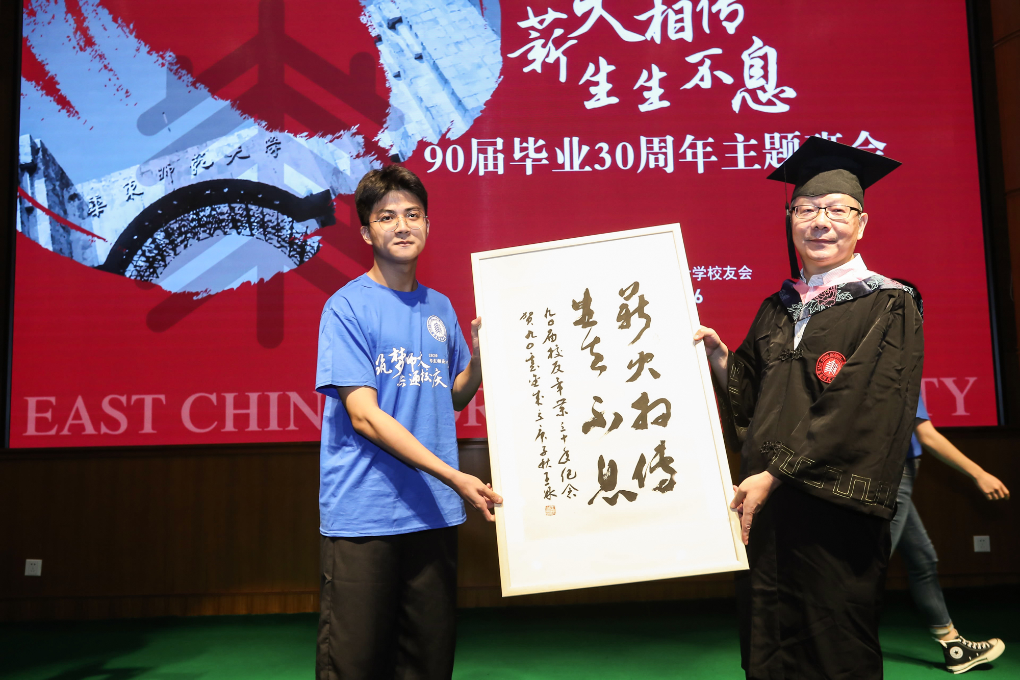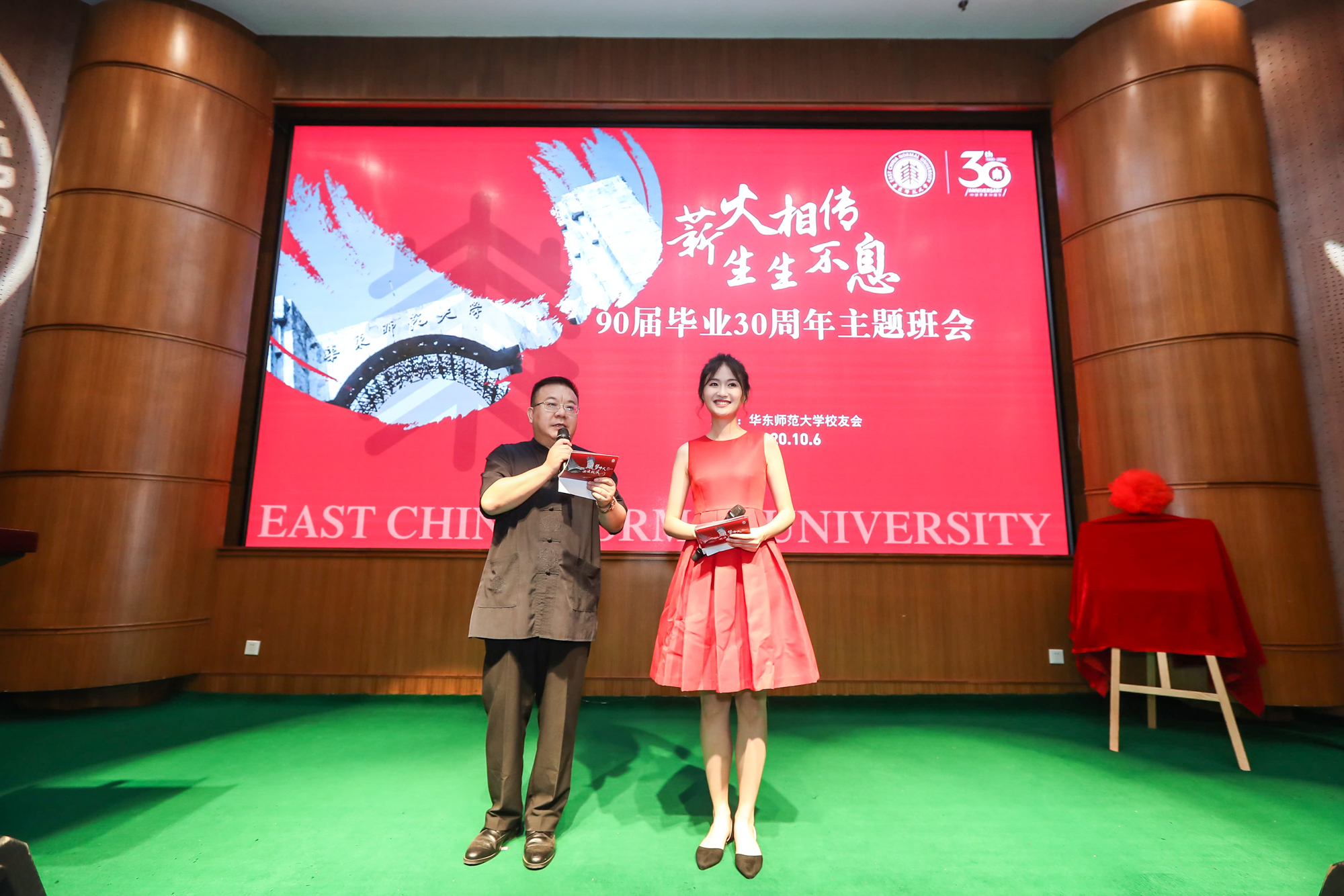 在今年的校友日活动中,来自12个班级百余名毕业三十周年的校友与恩师们欢聚一堂,举行了一场特别班会,重温美好校园生活。主题班会由1986级生物系朱玉童校友、2017级播音与主持专业杜金芮同学主持,班会在响亮的班级点名声中开场。
