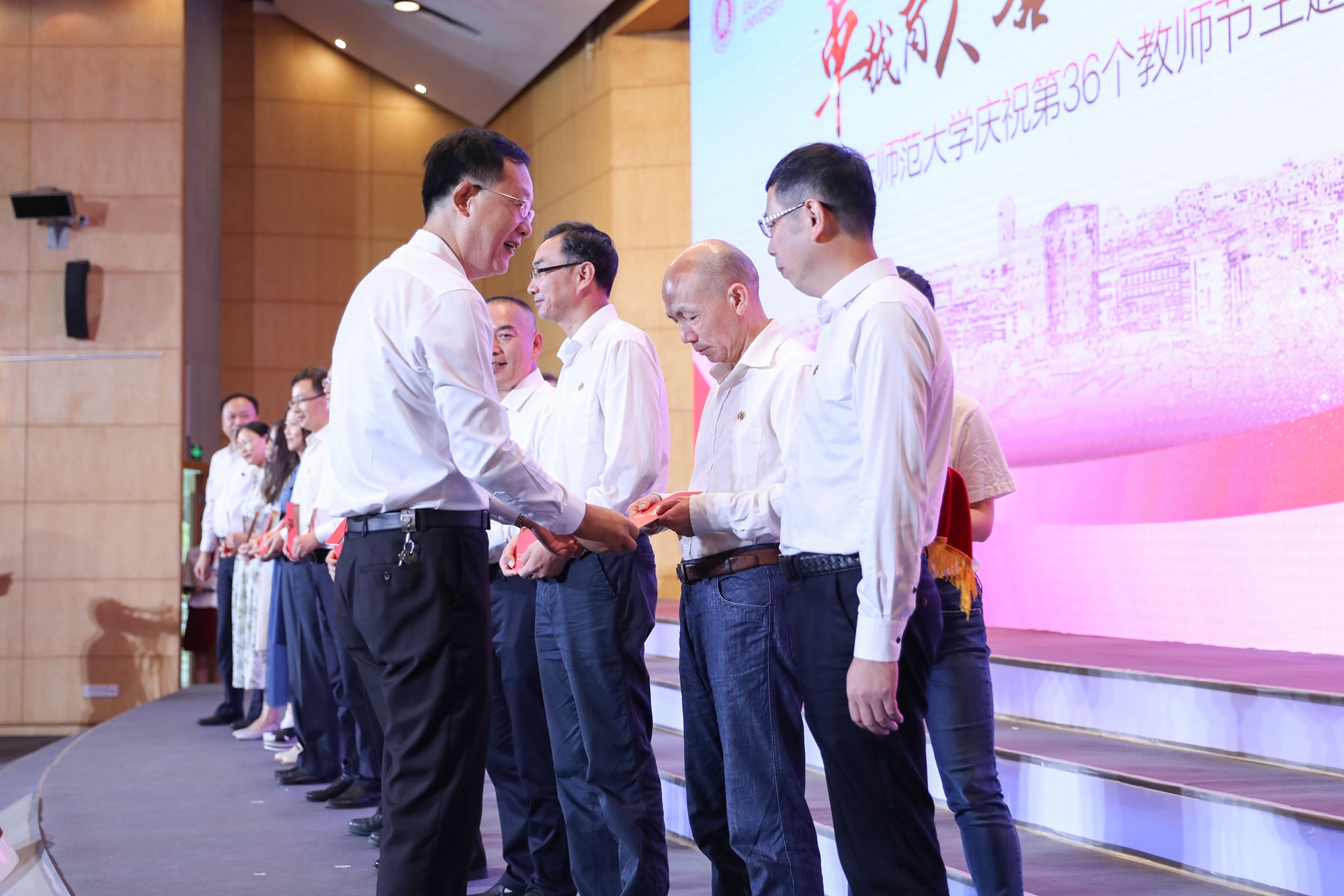 在全场热烈的掌声中,校领导朱民、王宏舟、杨昌利、曹友谊、李志斌、戴立益分别为第十二届师德标兵和满30年教育工作龄的教师颁发奖杯和纪念证书,今年新入职的教师代表向受表彰的教师献花致敬。