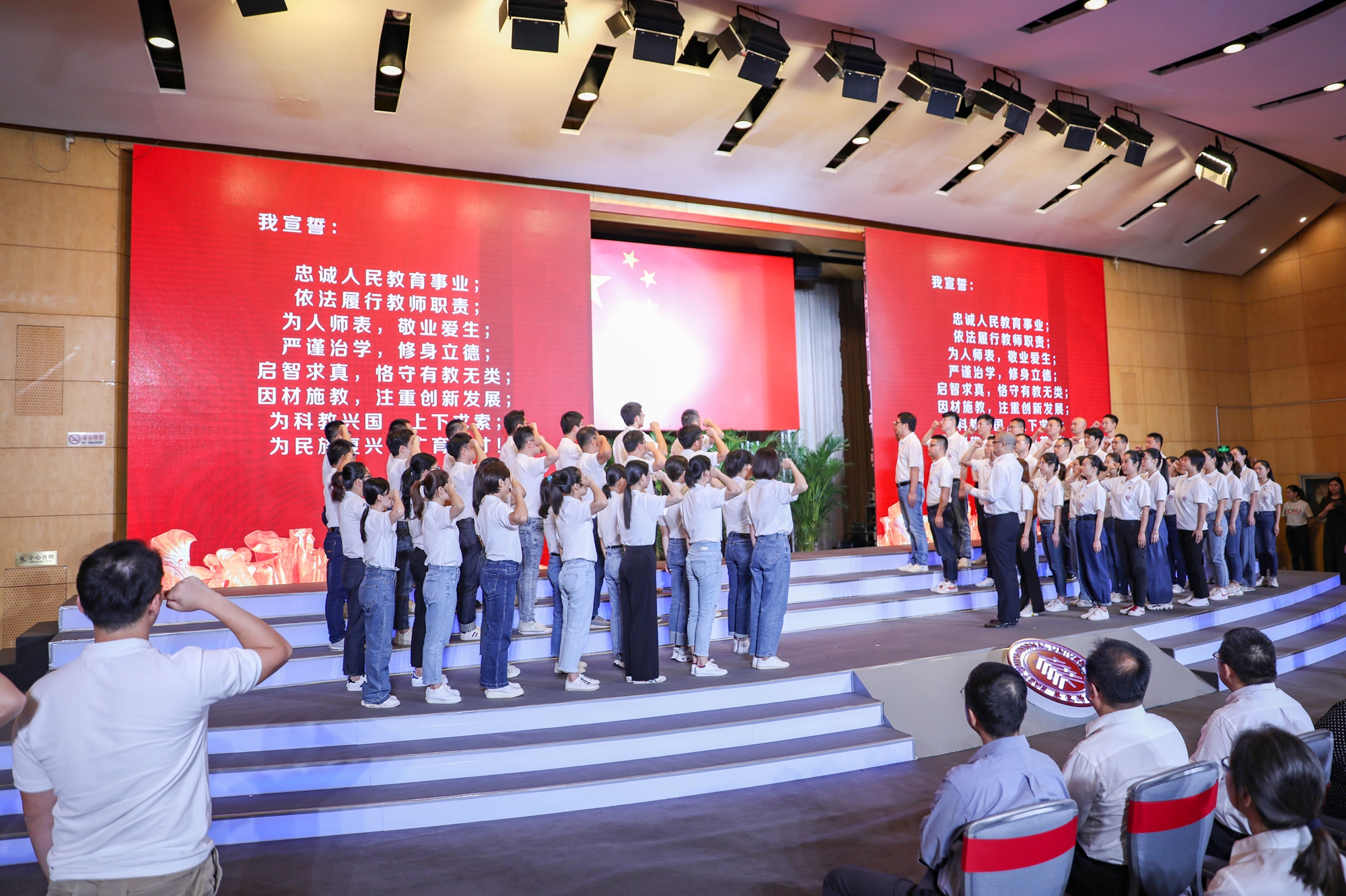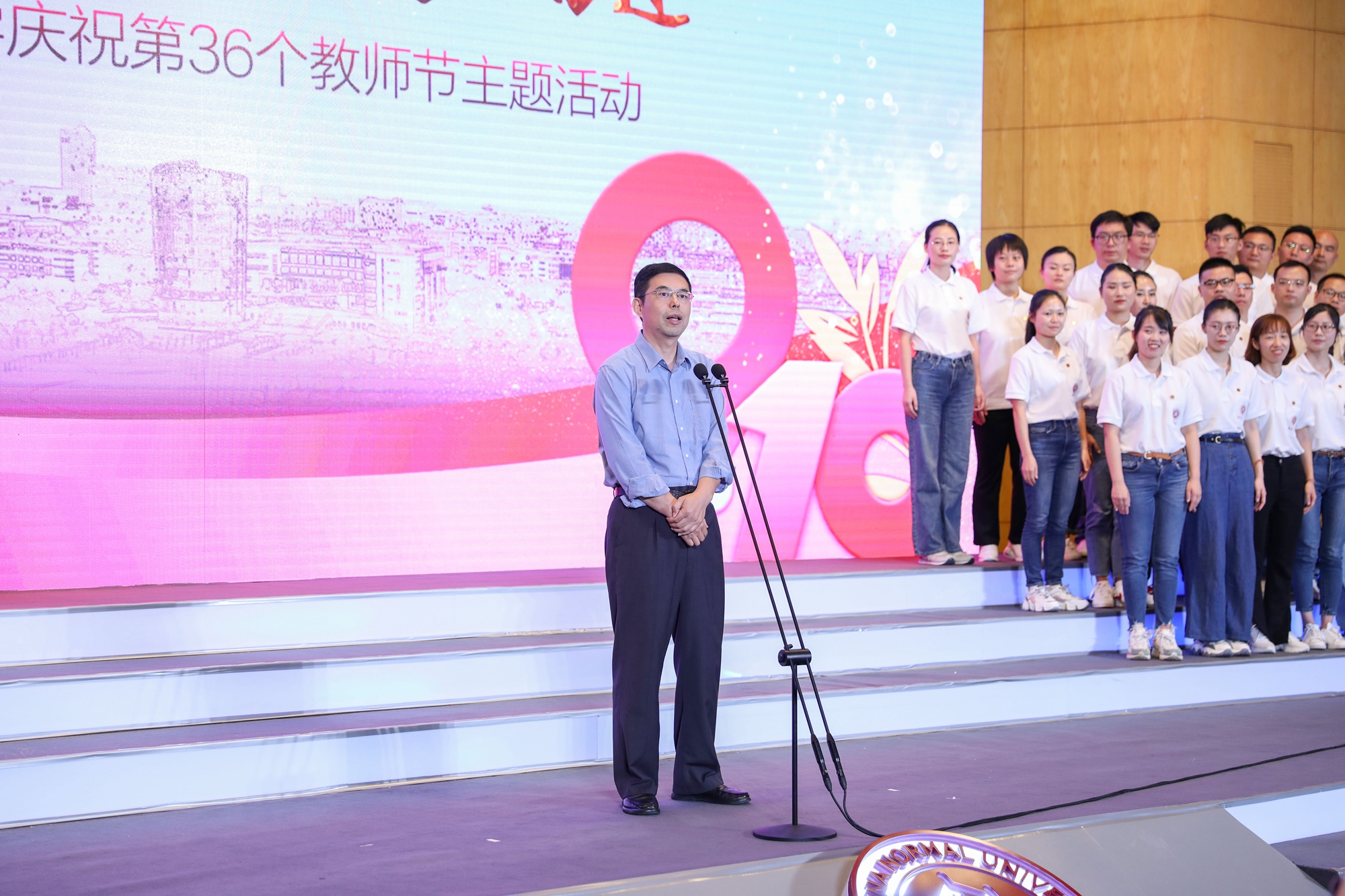 校党委副书记朱民在致辞中代表学校向敬业爱生、潜心育人的全体一线教师和广大离退休老同志,致以节日的问候和崇高的敬意,向所有关心支持学校各项事业发展的广大校友和社会各界人士,表示衷心的感谢。朱民指出,“善之本在教,教之本在师。”尊师重教是我们中华民族的优良传统。在这个教师自己的节日里表彰学校第十二届师德标兵和30年教育工作龄的老师,并举行新入职教师宣誓仪式,既是为了弘扬先进典型,传承师道,更是为了不忘初心,激励担当。