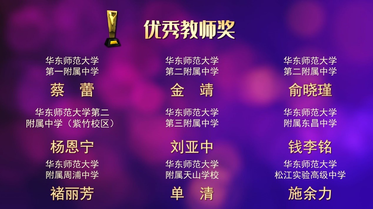 表彰会现场,华东师大副校长、基础教育与终身教育发展部部长、教育集团主任戴立益,华东师大二附中校长、教育集团副主任李志聪,华东师大一附中校长陆磐良,基终部副部长施洪亮、冯剑峰、韩楠等与老师们共襄节日的喜悦。表彰会由基终部副部长刘萍主持,分“初心”“奋战”“桥梁”三个章节进行。