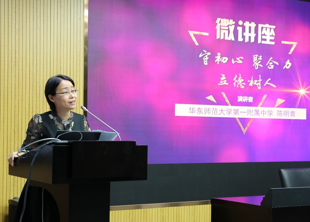 此次表彰会还特邀2019年获“全国模范教师”称号的万象城awcsport官网第一附属中学陈明青老师带来讲座。陈老师以“守初心、聚合力、立德树人 ”为主题,从她对什么是立德、什么是树人的思考阐述了“立德树人”的重要性。她还分享了职初时期在带教师傅11个教学追问的激励下,不断探索与创新思政课模式的经历。她认为,“信仰是有味道的,学生能从老师的身上感受到。如何使学生体验到信仰的味道,教师本人很重要,用于进行道德教育的方式也十分重要。”陈老师号召大家一起努力,聚合学科力量,“立德树人勇担当 ,辛勤耕耘育桃李”。