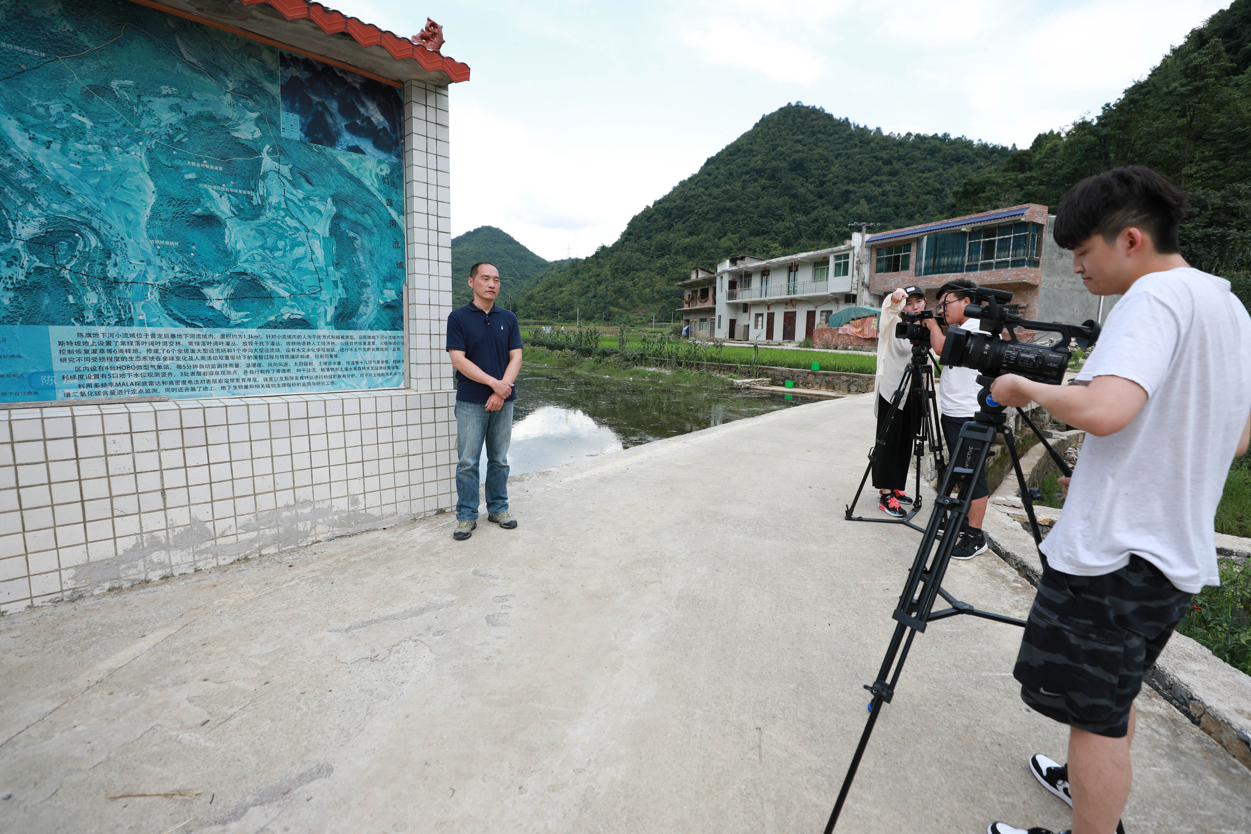 华东师大地理科学学院王东启教授站在陈旗地下河小流域喀斯特坡地上录课