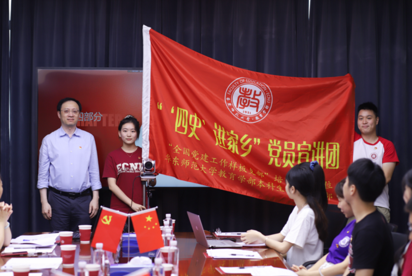 作为教育部“三全育人”综合改革试点单位、“全国党建工作标杆院系”培育创建单位,教育学部党委一直在为更好地落实立德树人根本任务,凝聚更多育人合力。为使“四史”学习教育进一步入脑、入心、入行,学部党委指导本科生联合党支部成立“‘四史’进家乡”党员宣讲团,鼓励学生党员们带领团员青年一起,发挥教育学科师范生的优势,利用假期为家乡的大中小幼等各学段的学生讲好“四史”故事,挖掘家乡“四史”教育资源,并帮助家乡打造“四史”文化品牌。在组织生活会上,市教委副主任贾炜为宣讲团授旗,一场“让身边人讲好身边事、让身边事激励身边人”的“四史”进家乡之旅由“90后”“00后”开启。