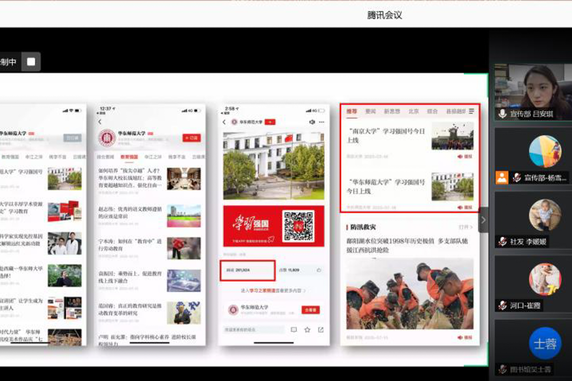 部分院系级党组织“学习强国”平台管理员分享了工作经验。地理科学学院党委副书记(挂职)、机关党工委罗艺介绍了机关党工委“以上率下,发挥头雁效应”“常抓常管,形成管理队伍”“联动推动,抓好时间节点”“发挥兴趣,做好全辐推进”等平台建设推广经验。生态与环境科学学院张琪介绍了学院党委通过选树“学习标兵”、以典型示范带动形成学习新风尚、营造良好学习氛围的积极探索。历史学系张园分享了增强党员师生对“学习强国”平台的粘合度的有益尝试,譬如通过发布通知、分享学习资源、召开视频会议、开展线上组织生活和主题党日活动等多种形式激活各师生党支部在平台上的群组。资产经营有限公司王娟介绍了公司党委班子成员身先示范,将用好“学习强国”学习平台明确作为班子成员加强日常理论学习的“规定动作”,建立健全从公司党委到各党支部的平台管理联动机制,常态化引导公司党员同志随时随地学、联系实际学。