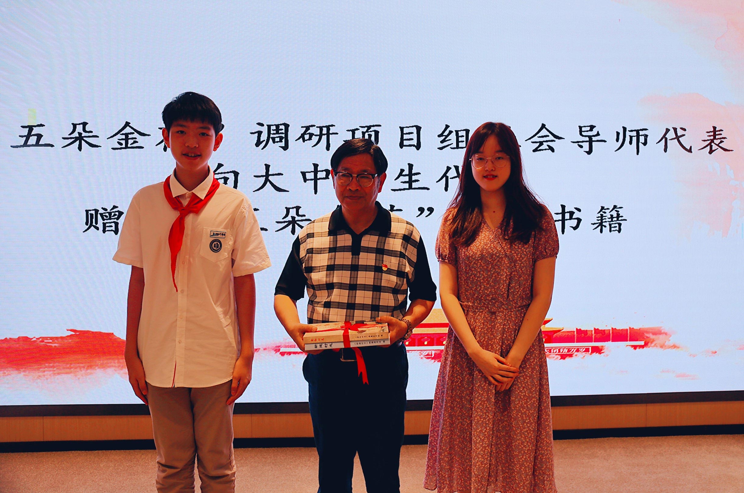 “五朵金花”调研项目组总顾问、吴泾镇社区党校讲师团团长王锦昌作为社会导师团代表,向大中学生赠送“五朵金花”相关书籍。王锦昌表示,“五朵金花”的历史与“四史”学习教育密切相关,要历史地、辩证地看待“五朵金花”的发展。在调研题目的选取上可以考虑以工人阶级、先进科技、企业文化、发展轨迹、重大人物和主要荣誉等内容为关注点。“观今宜鉴古,无古不成今”,所有的回望都是为了向前,希望同学们走深走实,密切联系吴泾镇的发展实际开展调研。