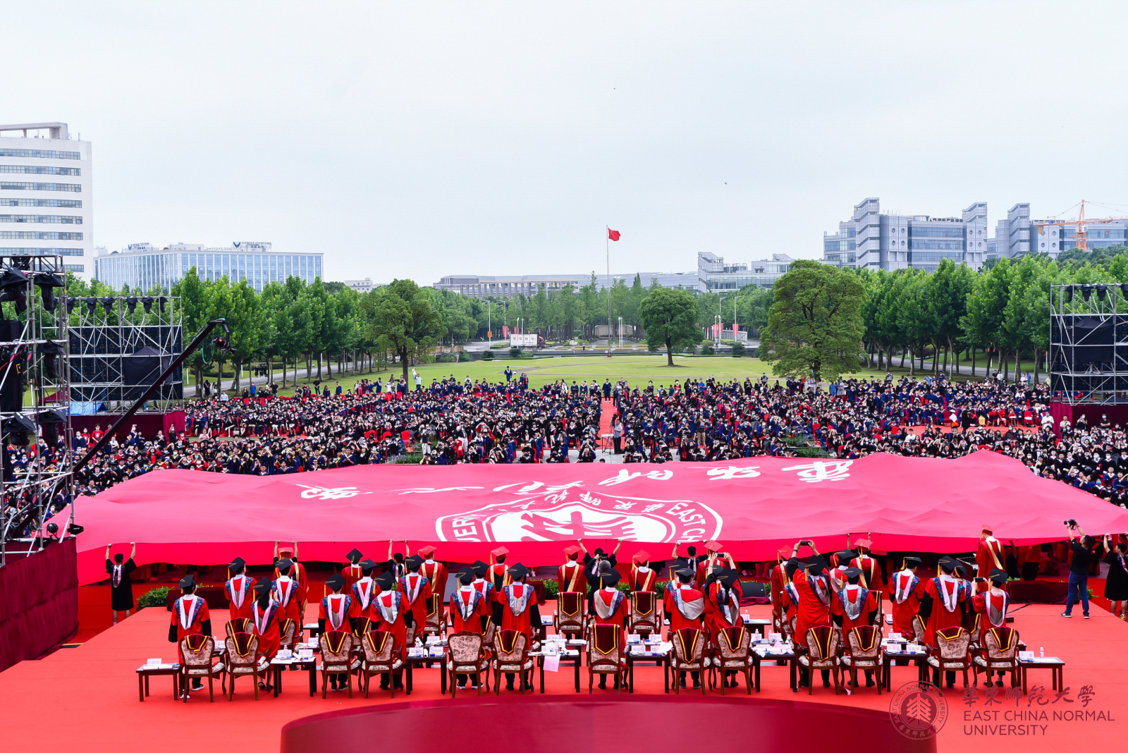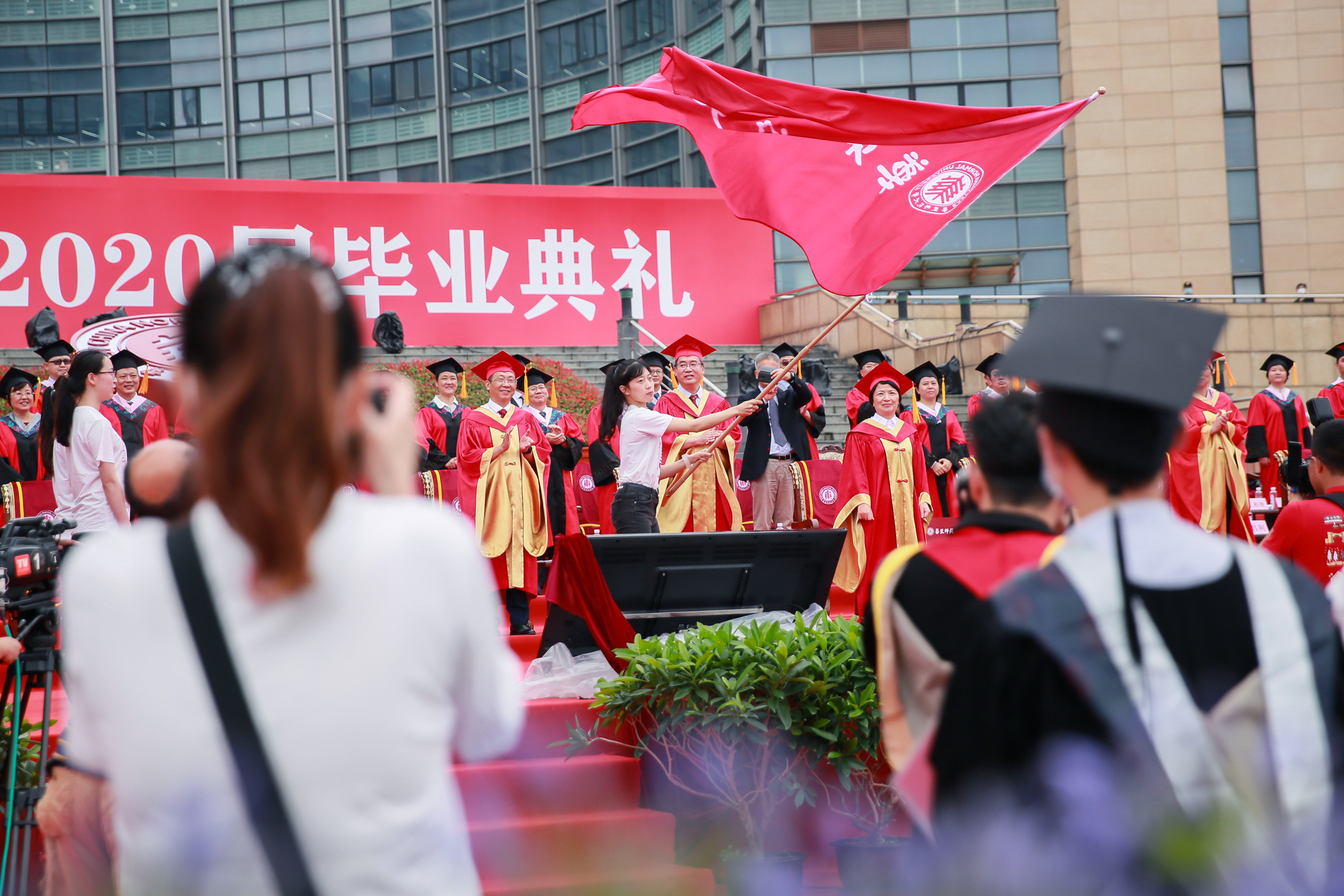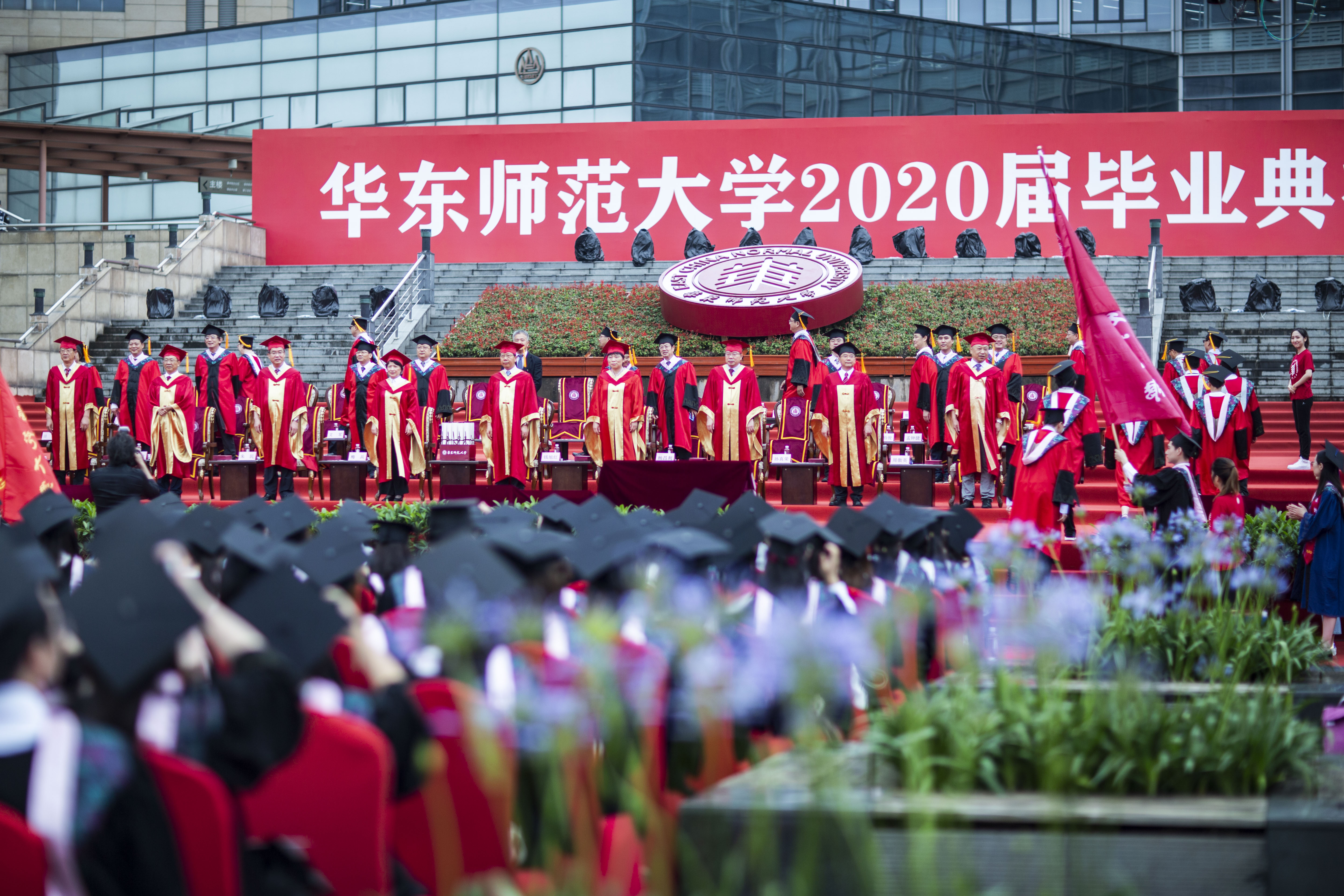 鲜红的巨幅校旗从观众席后面缓缓往前平移,将毕业典礼推向高潮