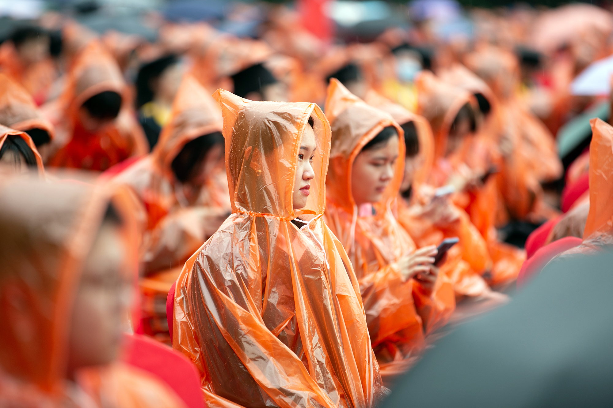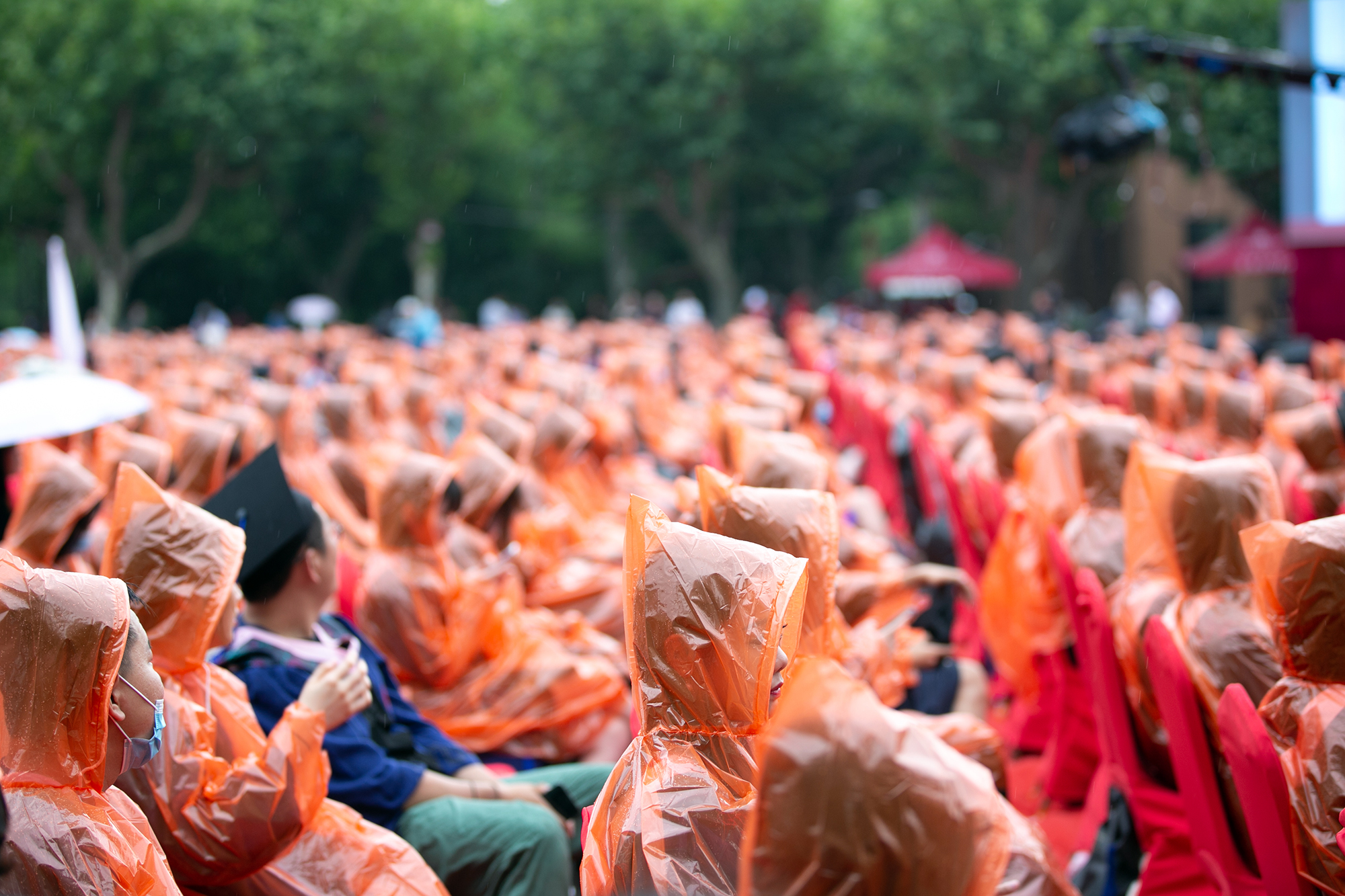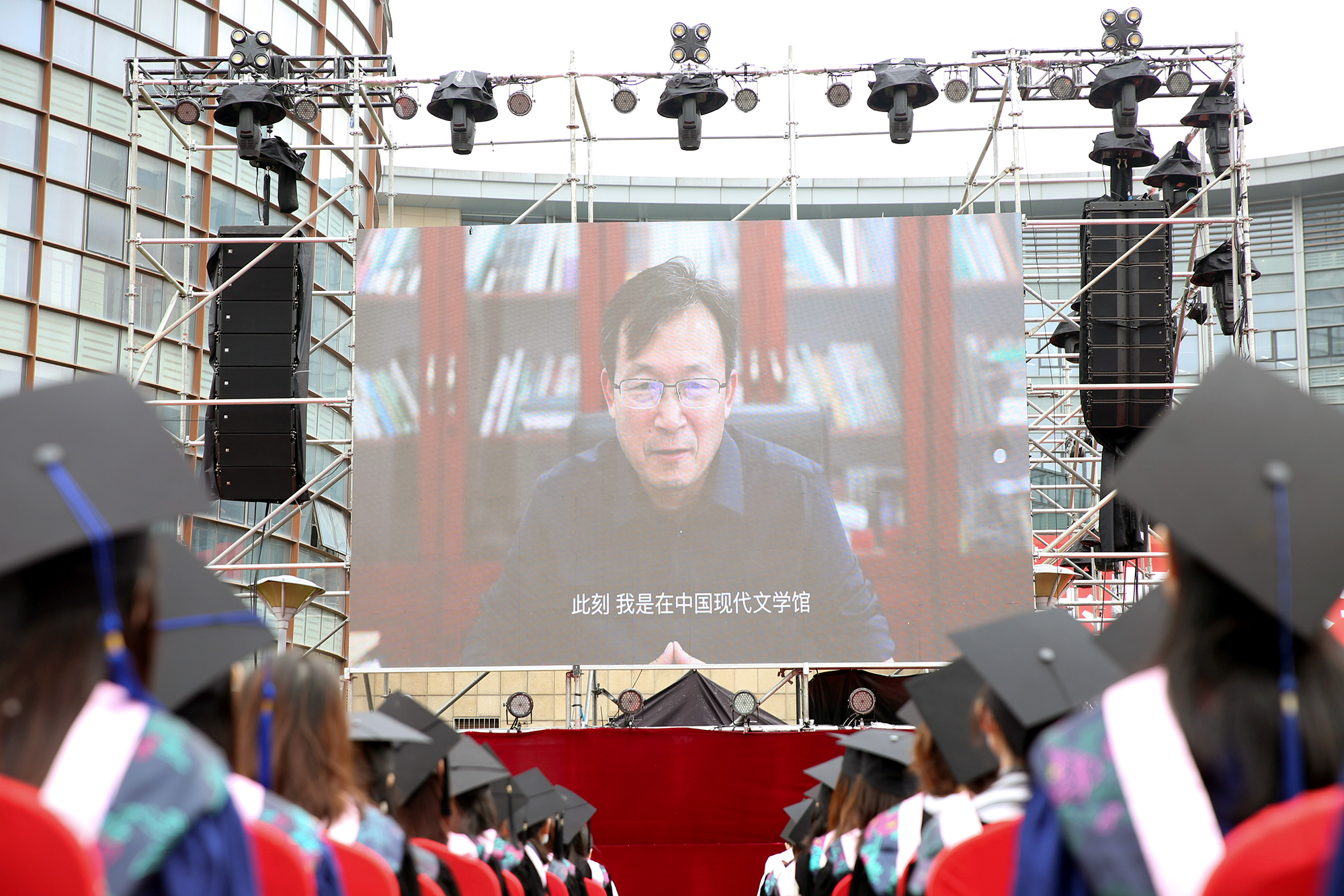 鲜红的巨幅校旗从观众席后面缓缓往前平移,将毕业典礼推向高潮