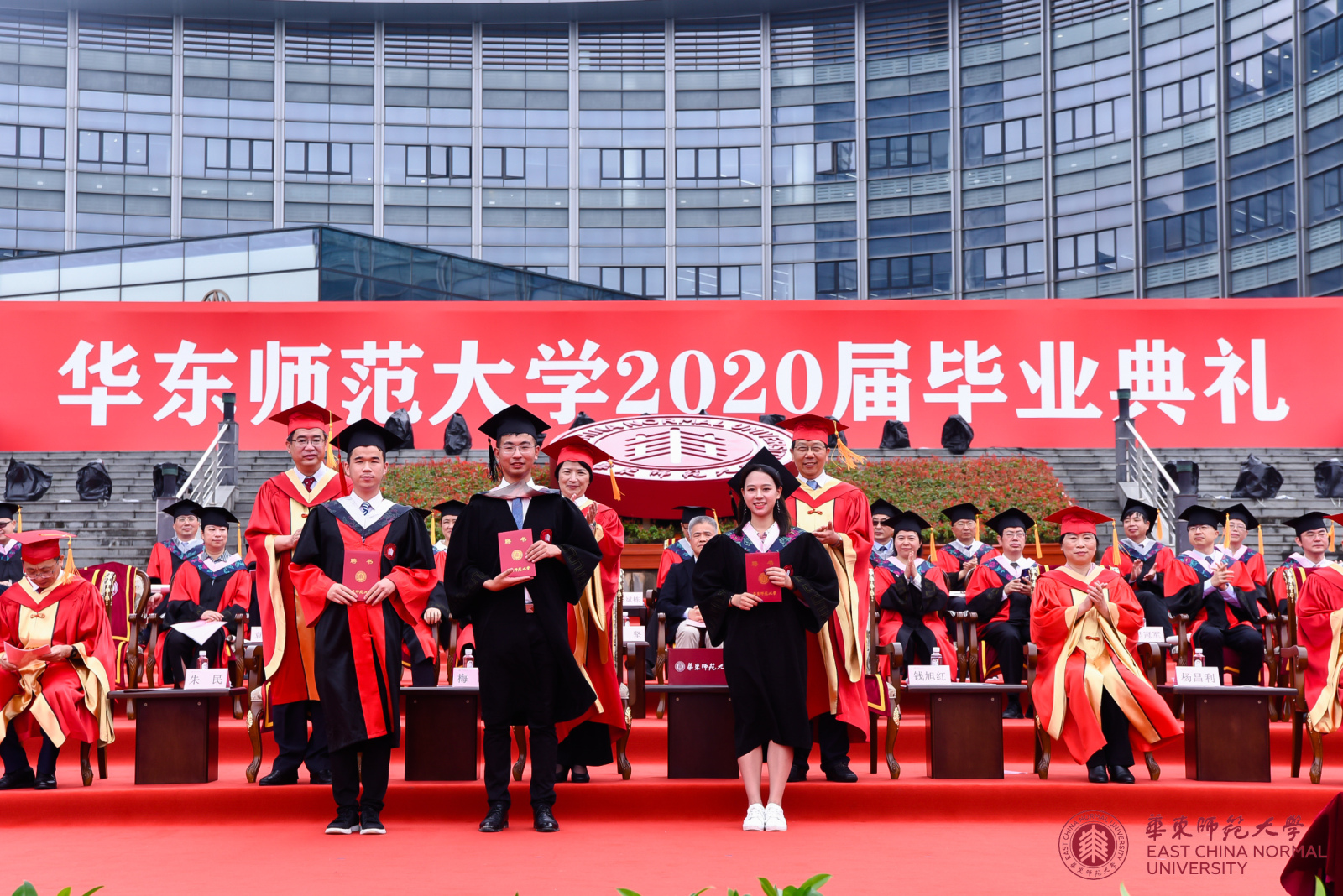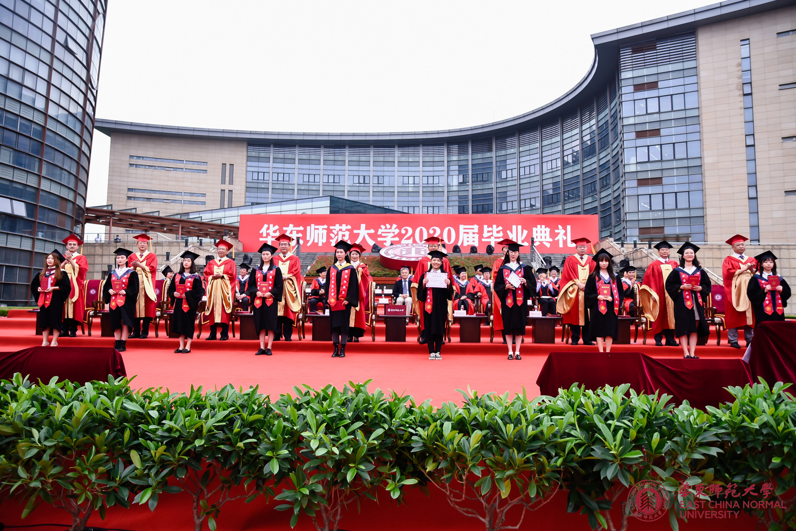 校长、校学位评定委员会主席钱旭红向各学部、院系负责人颁发学历学位授权书,希望通过他们将这份荣耀和祝福传递给每一位毕业生。毕业典礼上,416名上海市优秀毕业生和469名校优秀毕业生获得表彰,全体校领导为优秀毕业生代表颁奖;校党委书记梅兵为“学生心目中最优秀教师”颁奖。自2001年起,华东师大每年在本科毕业班学生中开展“评选你心目中最优秀教师”活动。连续五年被本科毕业生评选为最优秀教师的老师,学校授予“学生心目中最优秀教师奖”。综合近五年本科毕业生评教结果,2020年度“学生心目中最优秀教师奖”获得者是政治学系易妍老师,传播学院罗薇老师,经济与管理学部金铸老师、叶明华老师,体育与健康学院张中印老师,国际汉语文化学院尚雅楠老师、蒋冰冰老师,教育学部占小红老师。此次获奖教师奖金由上海青浦区安乔私立幼儿园捐赠。