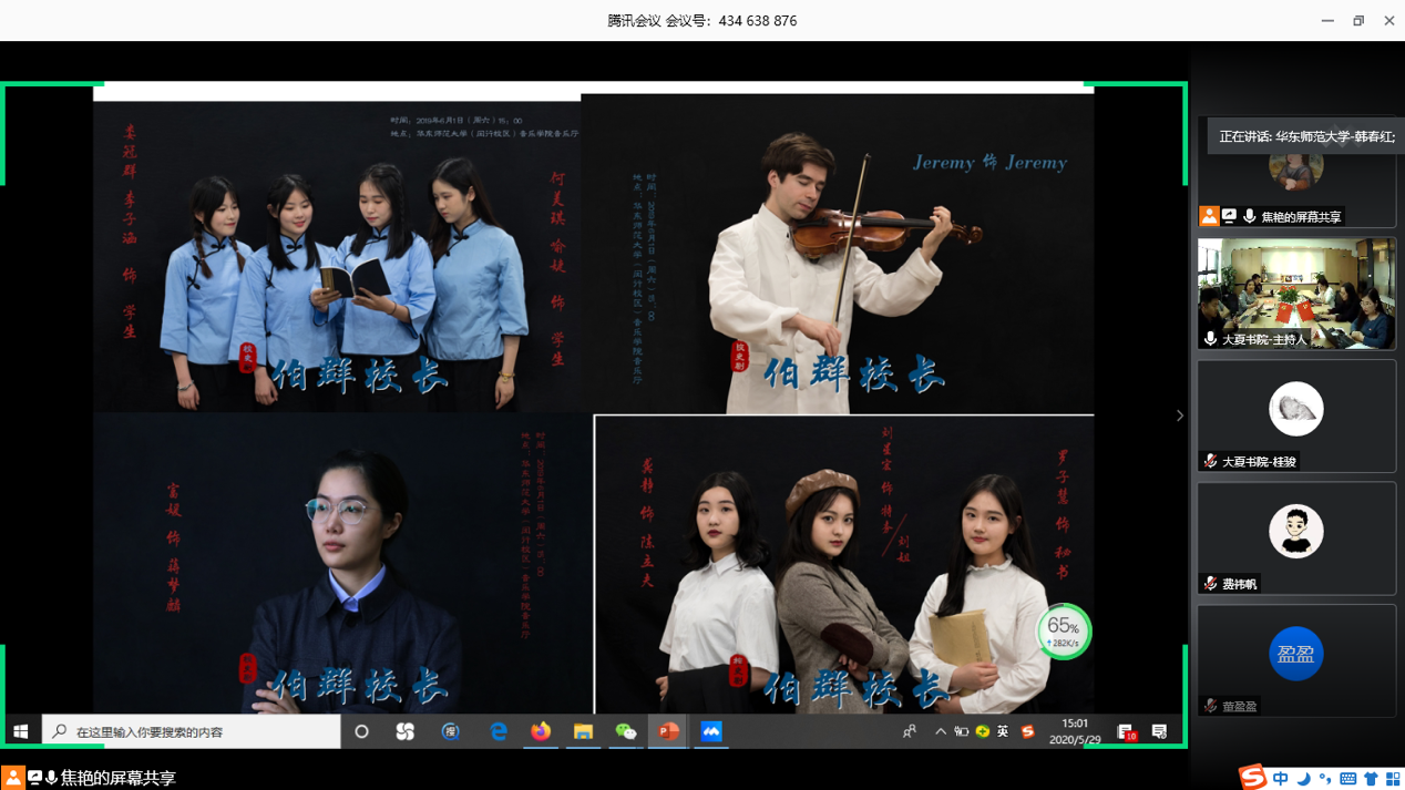 6月1日是大夏大学建校纪念日。为纪念万象城awcsport官网前身学校之一的大夏大学建校96周年,进一步挖掘校本资源滋养师生,5月29日下午,华东师大召开“高校校史剧的文化基因与育人力量”研讨会。会上,上海交通大学《钱学森》、浙江大学《求是魂》、上海大学《红色学府》和万象城awcsport官网《伯群校长》四部校史剧主创师生团队,围绕校本资源和育人传统在“云端”交流校史剧育人经验。