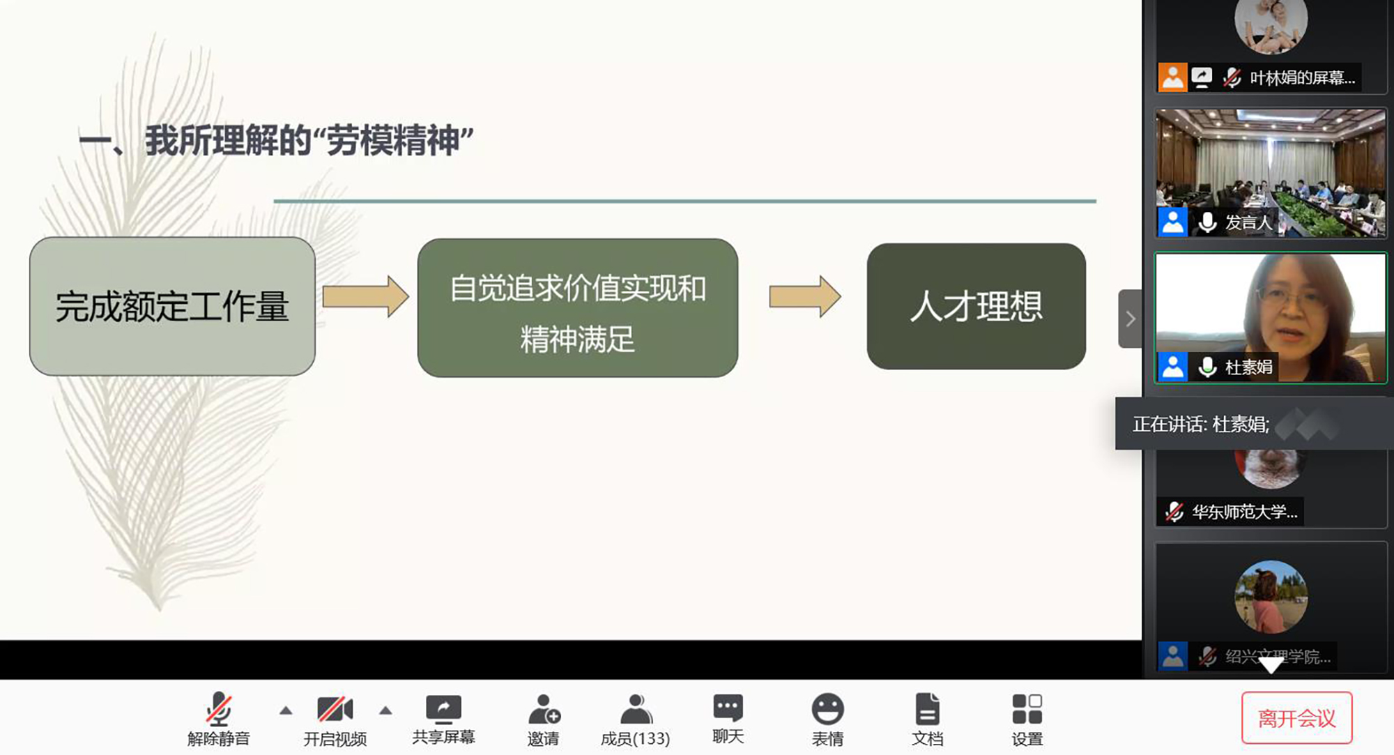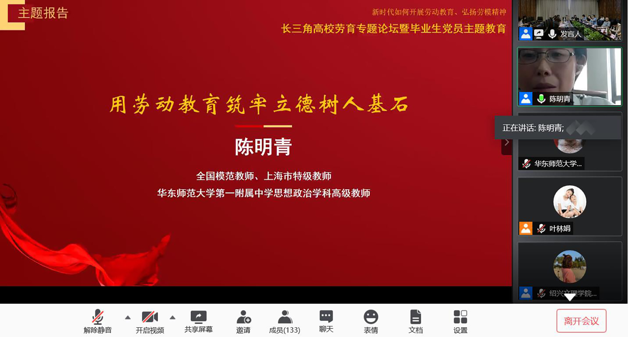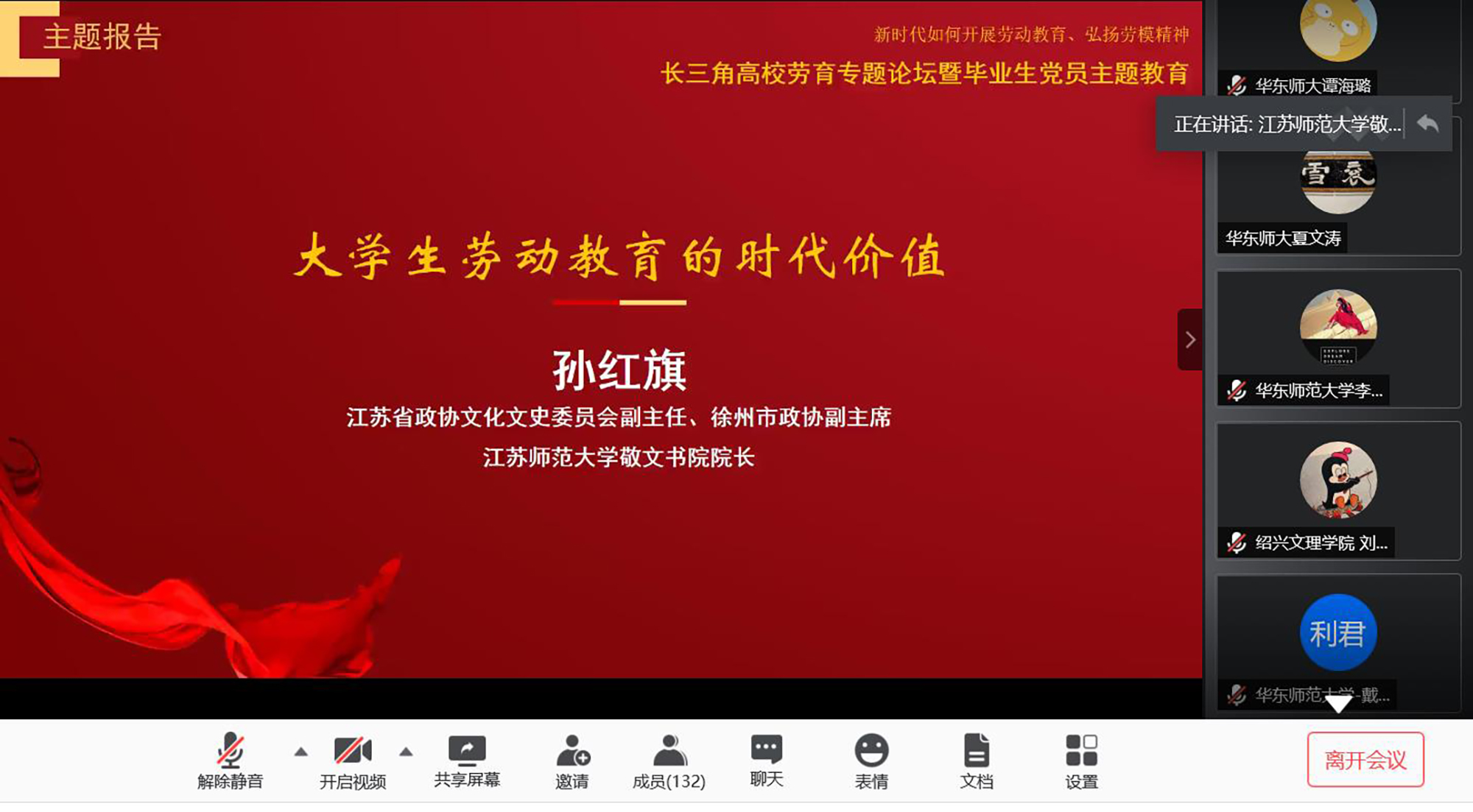 为了帮助毕业生党员树立正确的劳动价值观,深刻理解劳动精神和劳模精神,顺利步入融入社会、投身劳动实践,本次活动依托长三角高校书院劳育协作平台,邀请三位专家名师在云端为毕业生党员讲授“职前一课”。江苏省政协文化文史委员会副主任、徐州市政协副主席、江苏师范大学敬文书院院长孙红旗在以《大学生劳动教育的时代价值》为题的报告中,结合自身经历,深入阐述了新时代开展劳动教育的价值和意义,并以我国劳动教育的历史、现状及问题为切入,提出要在劳动教育中充分发挥家庭、学校、社会的作用,期待大学生不负时代,在劳动中实现自己的美好理想。