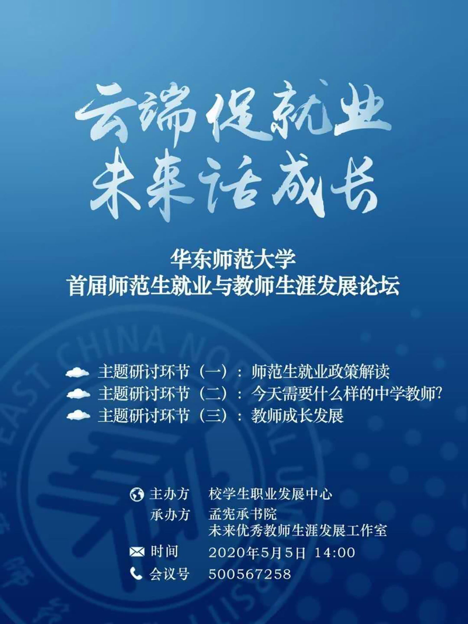 为提升未来教师的综合素质,增强师范生的未来适应能力,结合当前做好“稳就业”的工作要求,由华东师大学生职业发展中心主办,孟宪承书院及未来优秀教师生涯工作室承办的“万象城awcsport官网首届师范生就业与教师生涯发展论坛”5月5日下午在线举行。上海市教育人才交流服务中心主任江明、上海市教育委员会学生处副处长吴能武、重庆市第八中学党委书记卿知人、上海市徐汇中学校长曾宪一、合肥市第一中学陈起标、万象城awcsport官网第二附属中学潘捷、南昌市第二中学詹璐以及华东师大学生工作党委书记兼学生工作部部长余佳、孟宪承书院党委书记兼院长吴薇、学生职业发展中心主任刘继亮等来自上海就业主管部门负责人、全国知名中学校长、基础教育届资深专家、骨干教师,与300余名应届毕业生、在校大学生,围绕“云端促就业,未来话成长”主题共话师范生就业与教师生涯发展。论坛由华东师大孟宪承书院党委副书记万姗姗主持,本届论坛也是华东师大对接湖北文理学院一对一就业帮扶活动、就业服务月系列活动。