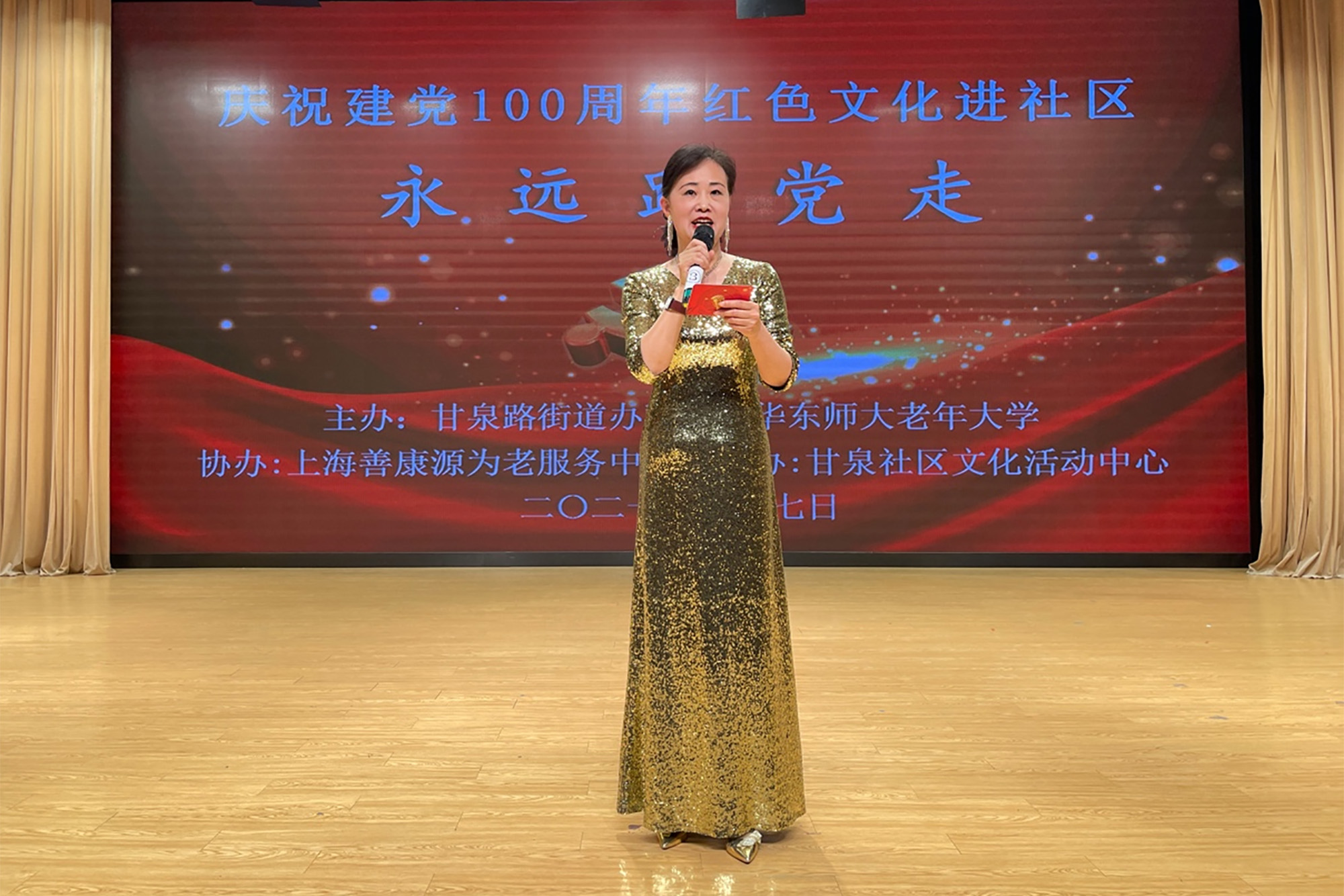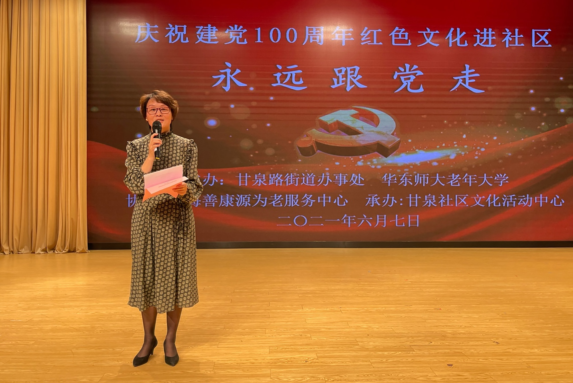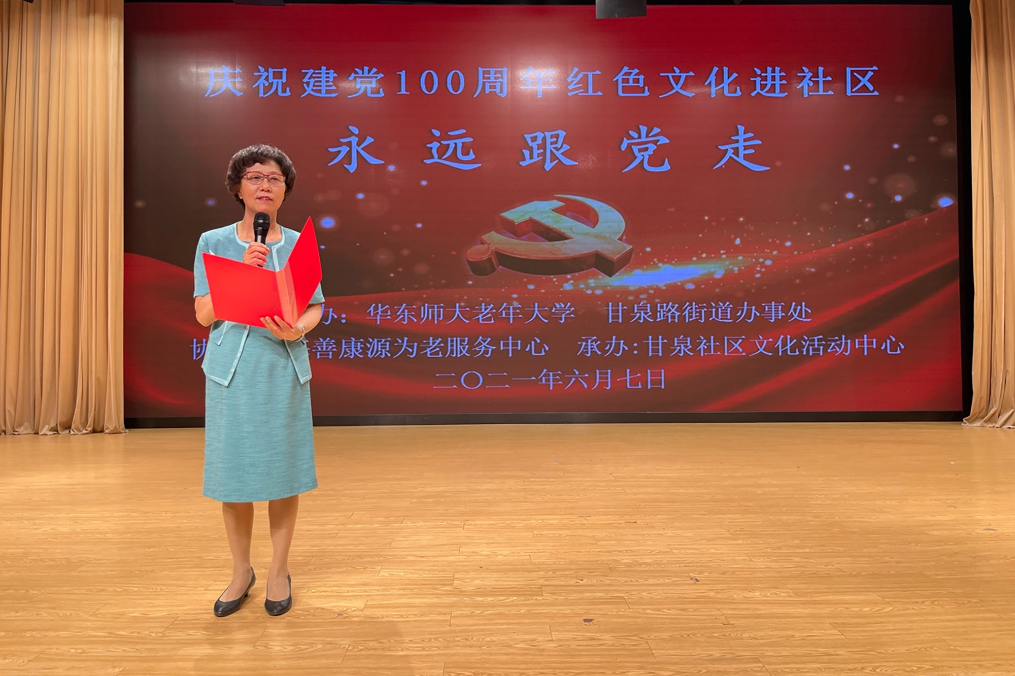 在语言艺术班教师程海芗的主持下,“永远跟党走”——华东师大老年大学庆祝建党100周年红色文化进社区文艺汇演拉开帷幕。