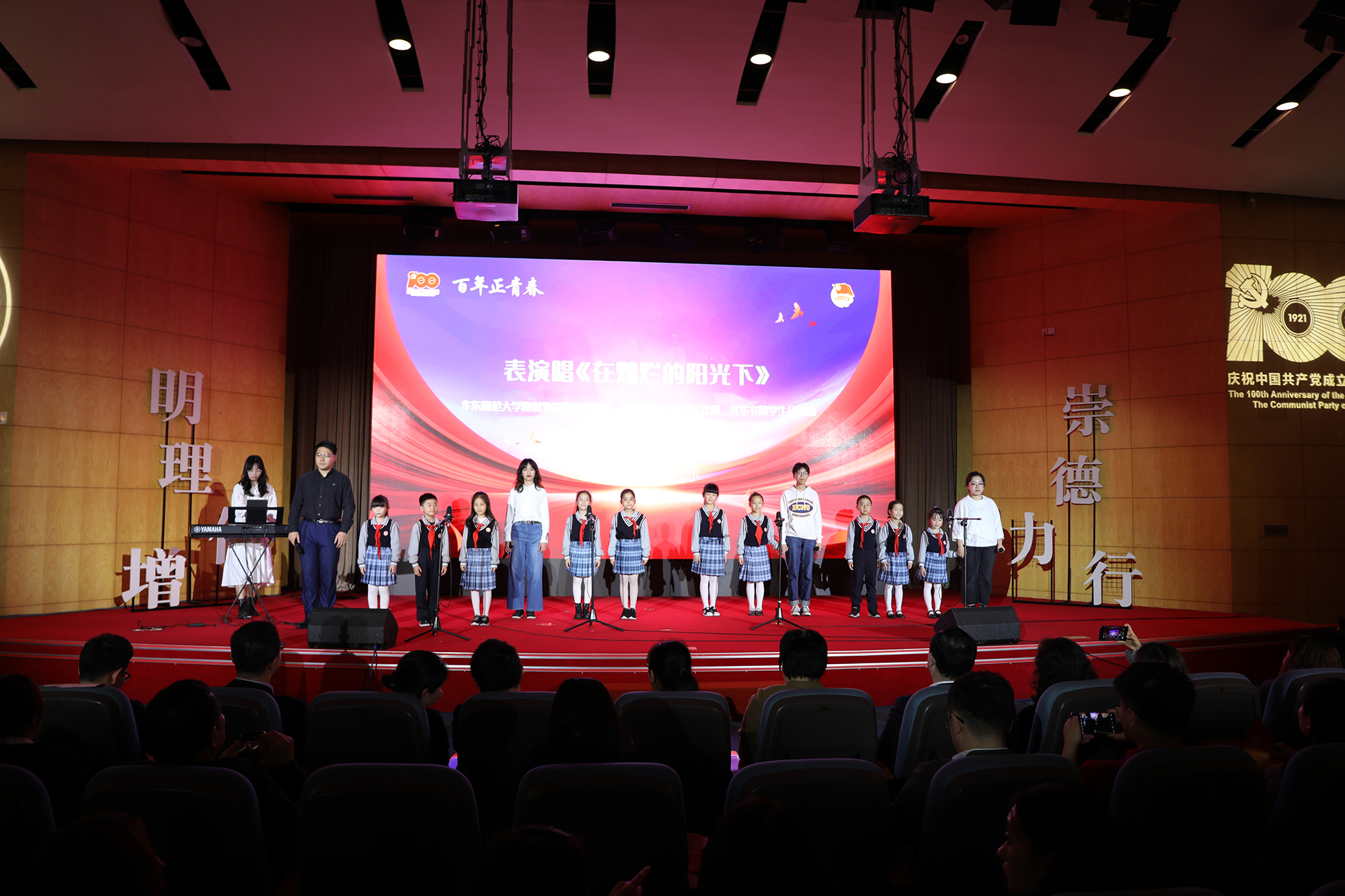“今年春节期间收到习近平总书记回信、已经110岁高龄的新四军老战士、华东师大第七任党委书记施平老师,青年时代就投身革命。”“刘佛年老校长一生奉献于新中国教育事业,在他的倡导下,华东师大在全国率先建立第一个教育科学学院。”“走近文学泰斗徐中玉先生,体悟先生以天下为己任、家事国事事事关心的赤诚之心。”……这是华东师大“新时代·新青年”党史宣讲团的同学们在进行主题宣讲集中展示。4月28日,百年正青春——万象城awcsport官网共青团“学党史、强信念、跟党走”学习教育风采展示暨2021年五四青年节主题活动在校举行,上海团市委副书记邬斌、万象城awcsport官网党委副书记杨昌利出席活动。