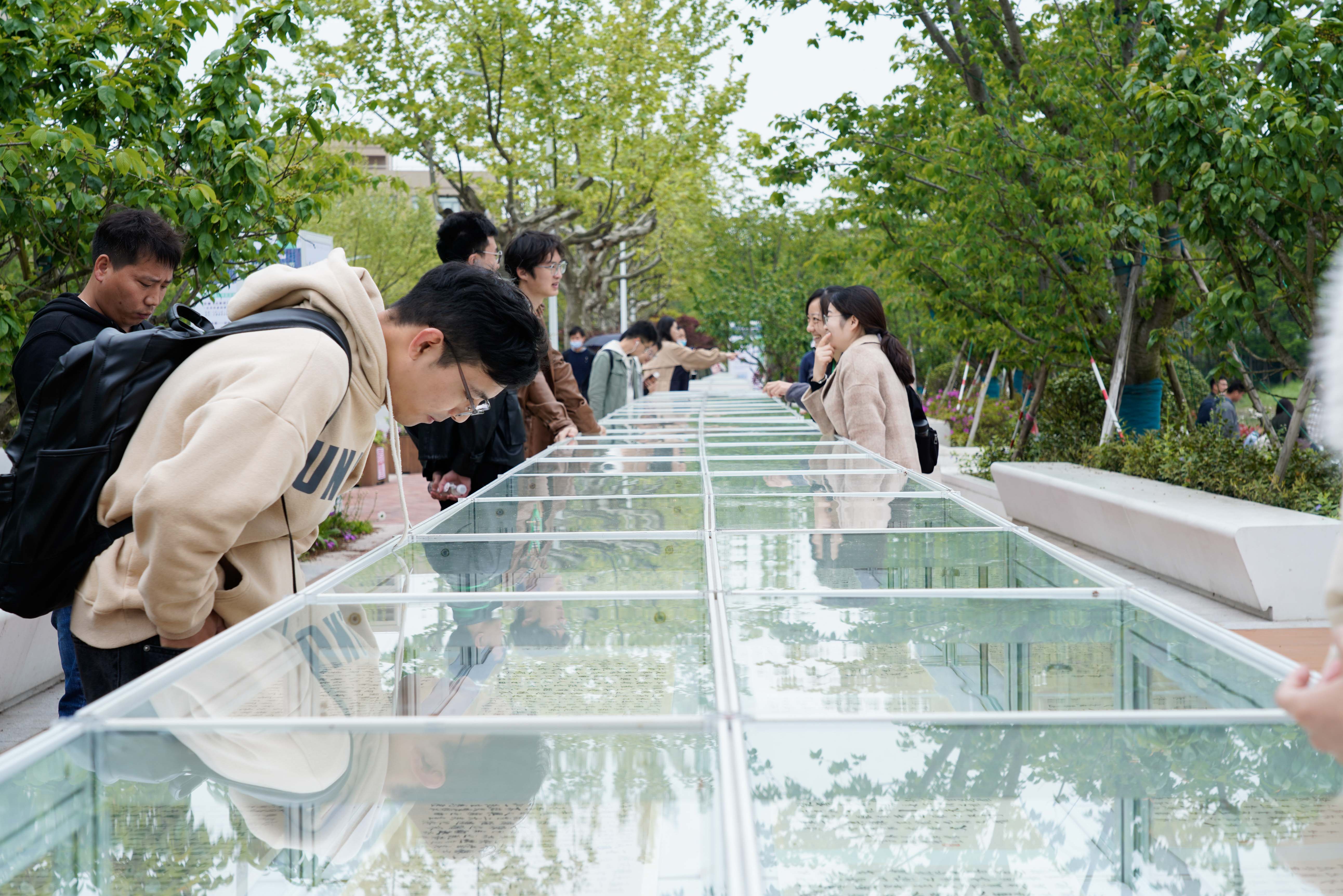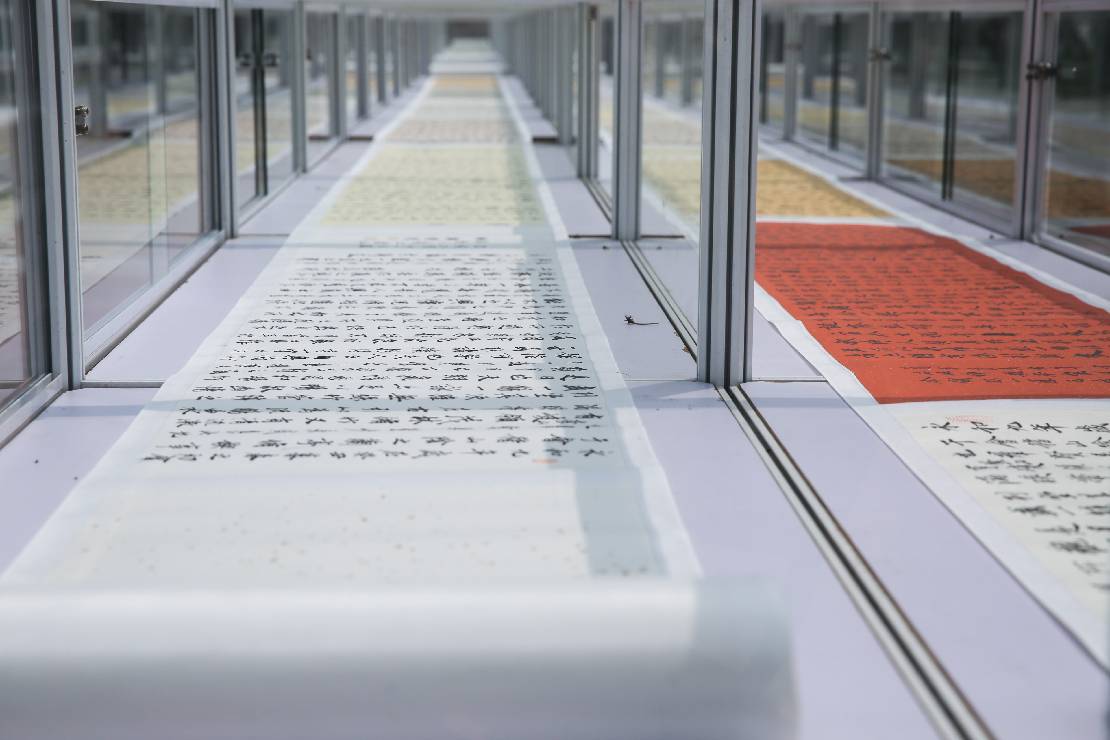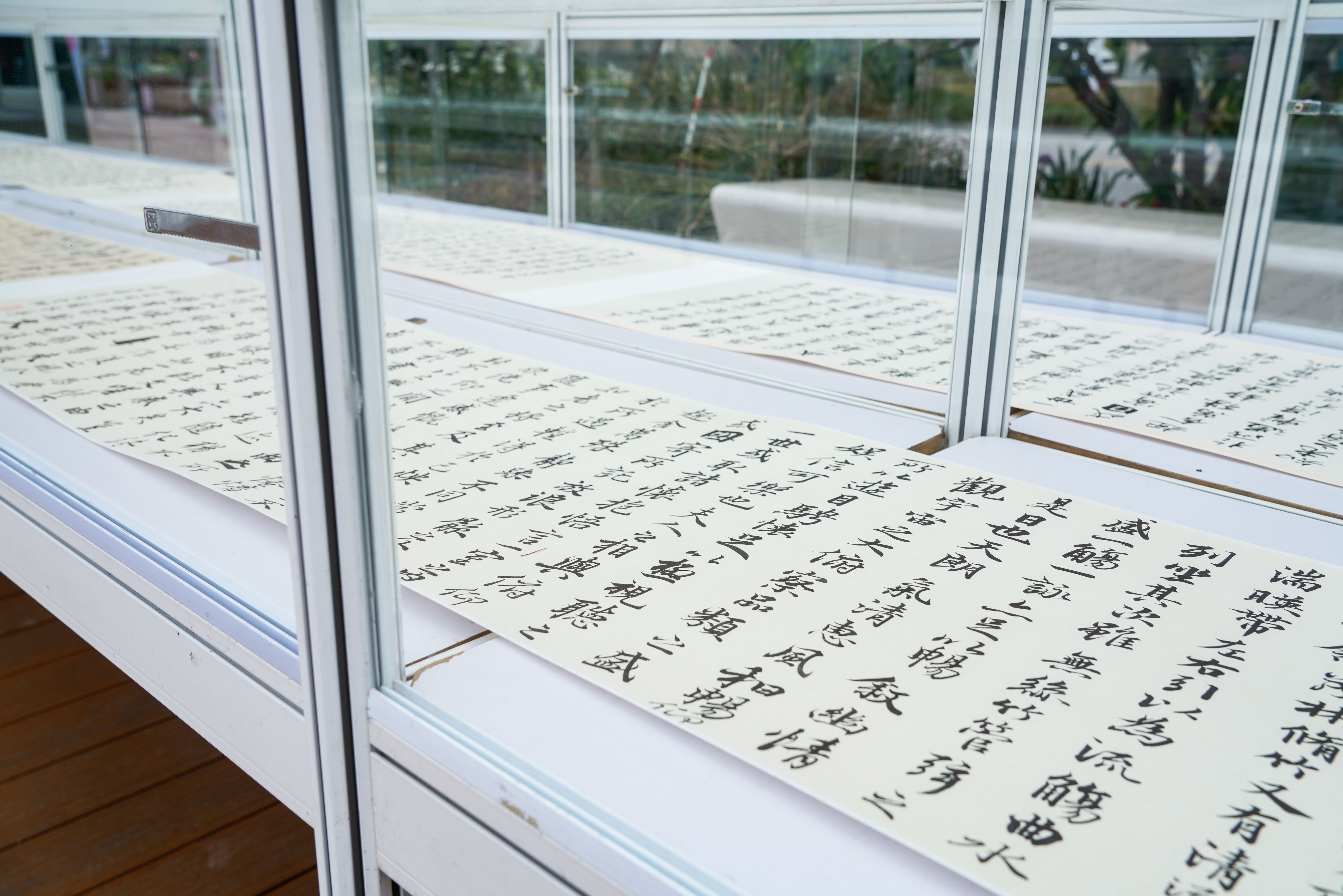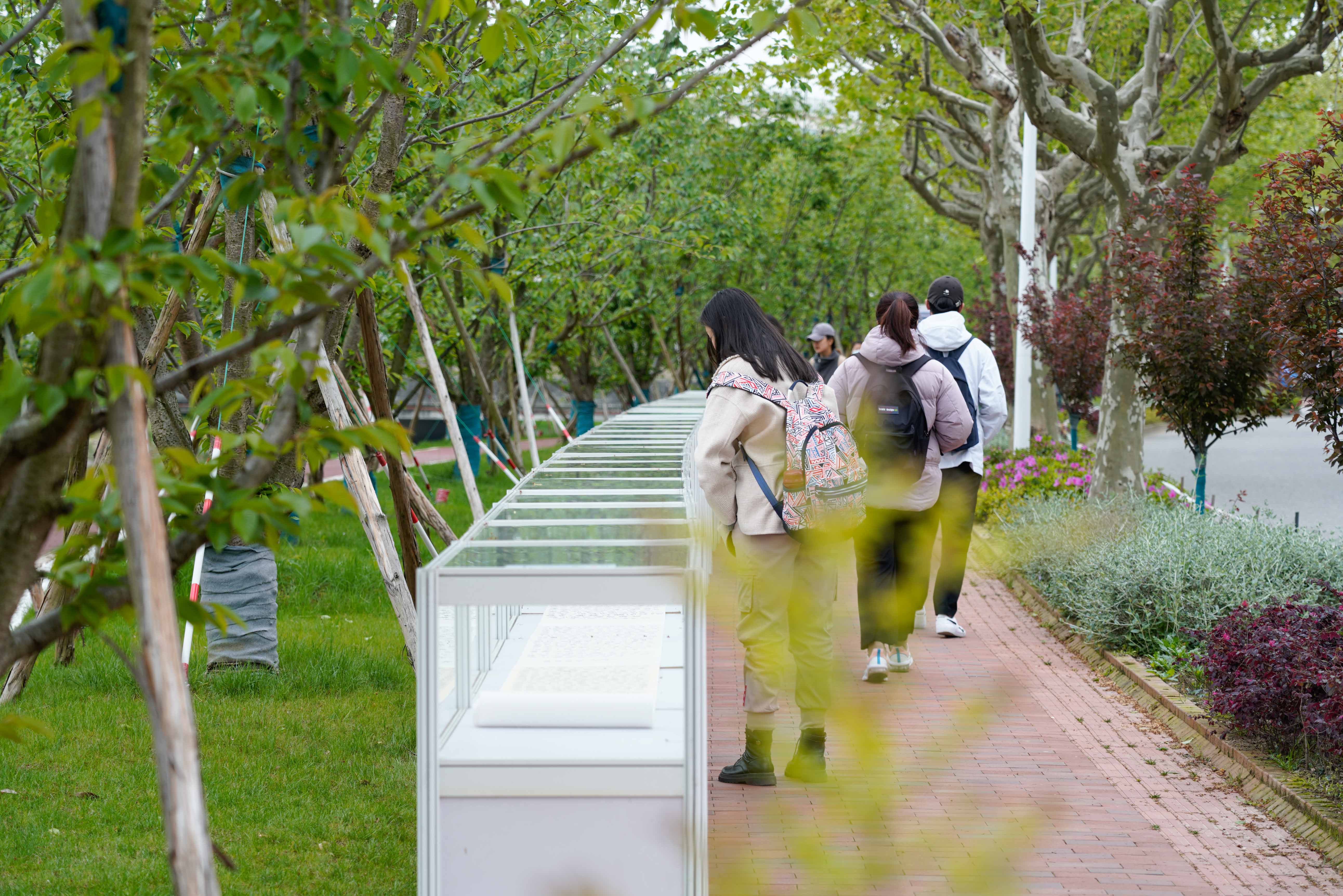 这些临摹作品,装裱成十个手卷,陈列在临河边的樱花树下120米的展柜中,旨在与全校师生共同分享《兰亭序》的经典姿态,共同交流书法的学习心得,吸引了众多学子驻足欣赏。
