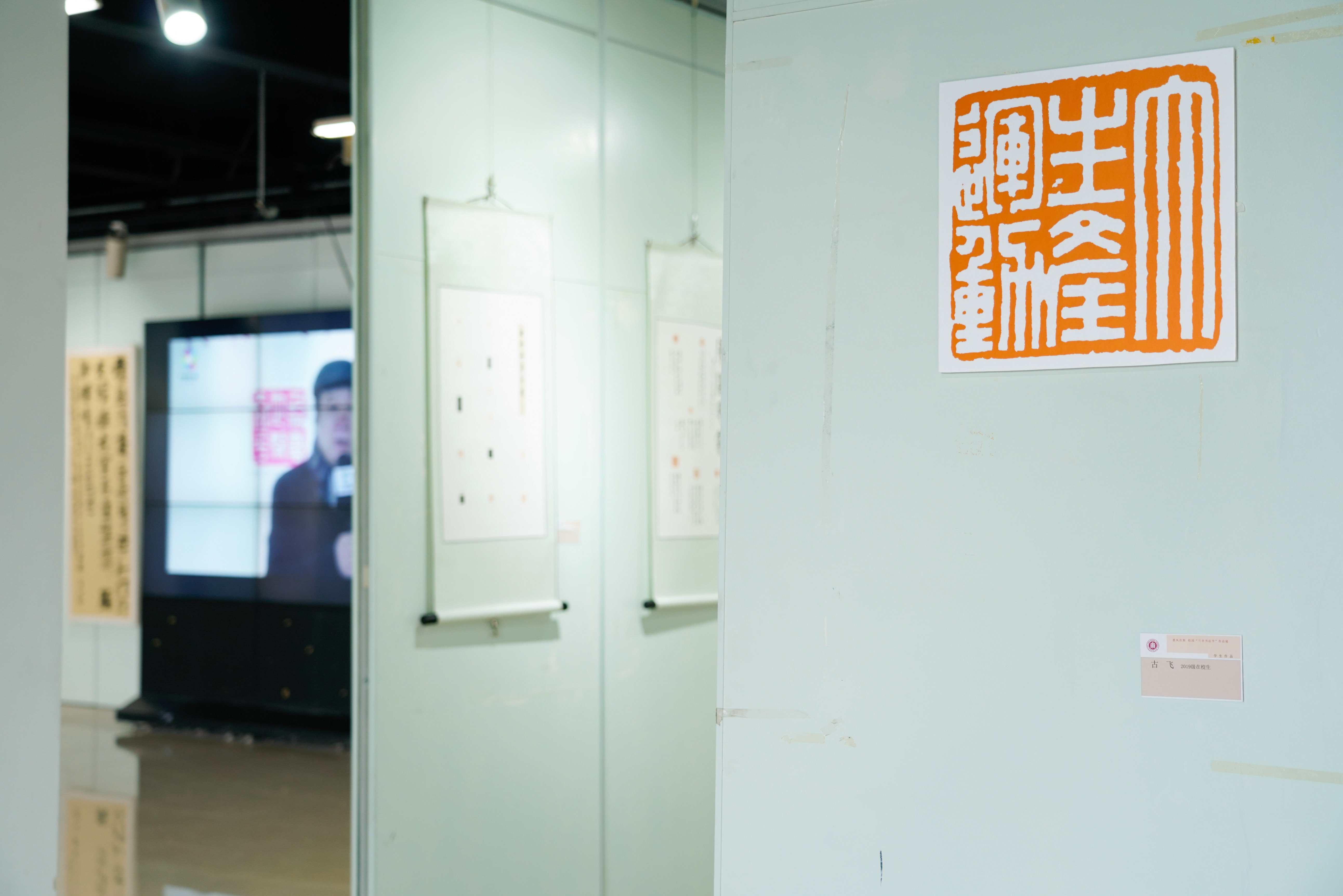 此外还有主题为“印证时代”的篆刻专题展。自去年华东师大篆刻传承基地落成以来,开展了一系列篆刻活动,在校园里掀起了一阵篆刻热潮。此次“印证时代”篆刻展是以建党100 周年为主题进行的专题展,通过作品,能够看到同学们对时代的歌颂与祝福。如郑瑾纶同学用铁笔镌刻下“人民当家做主”“工人阶级先锋队”的时代声音;孙瑾同学用铁笔碰撞出“战斗堡垒”“为万世开太平”的青年力量,体现出积极的精神面貌。展厅中有28幅印屏,其中“红色”主题篆刻有50余枚。各种状态的展示手段和方法在这里也得以体现,在现场能够感受到同学们完备的创作能力和多样的风格,以及对篆刻艺术的执着。