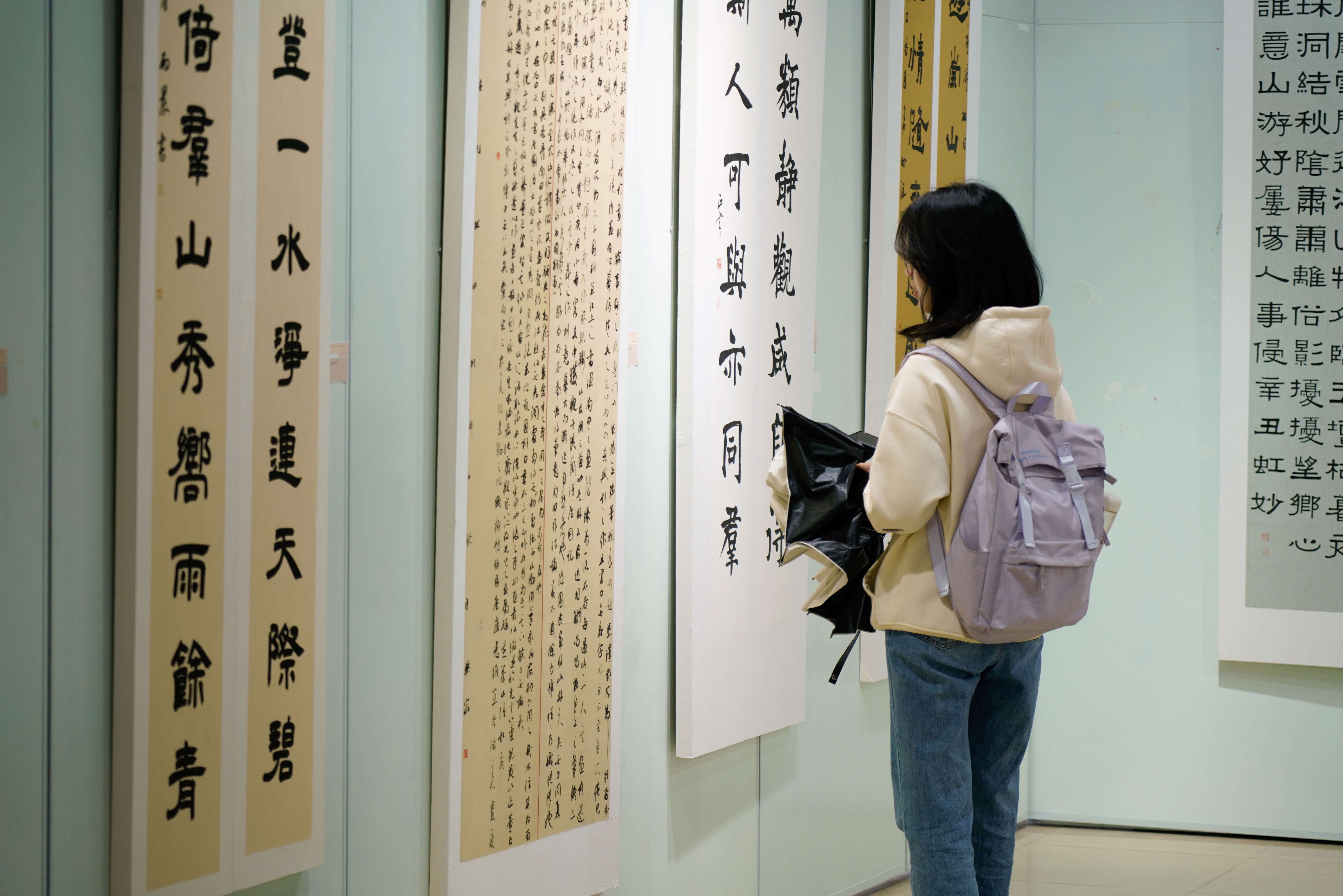在美术学院展厅,有书法篆刻专业同学创作的“兰亭”书法节作品展,展览包括书法作品及篆刻作品两部分,体现了书法篆刻专业同学们创作的积累。其中书法作品56幅,围绕以《兰亭序》为主题的集联或题咏诗展开,诸体兼备,形式多样。