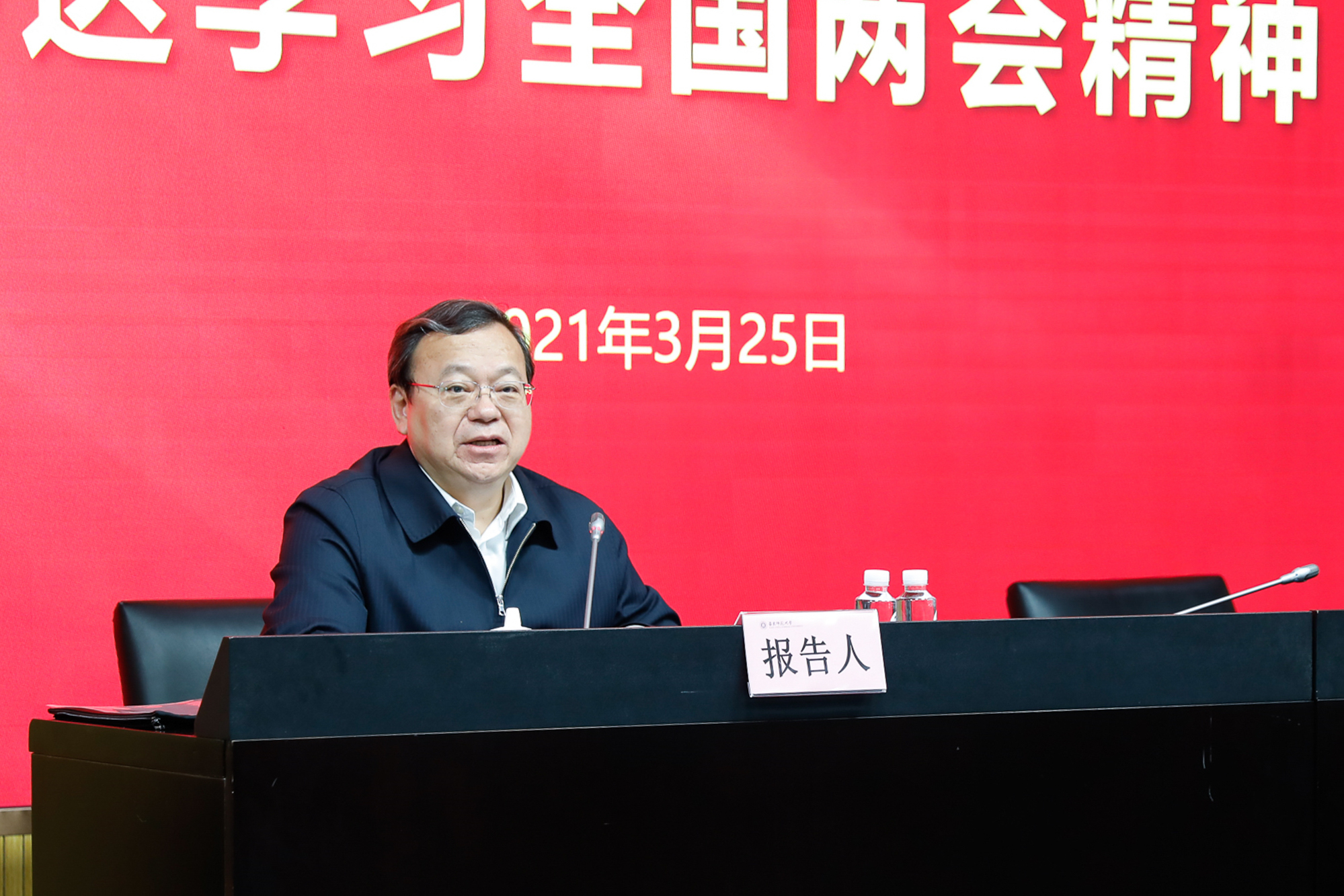 戴立益结合学校工作实际,引原文、举实例,解读了今年政府工作报告中关于教育的内容,讲述了现场聆听学习习近平总书记在全国政协十三届四次会议医药卫生界、教育界联组会上重要讲话精神的体会。