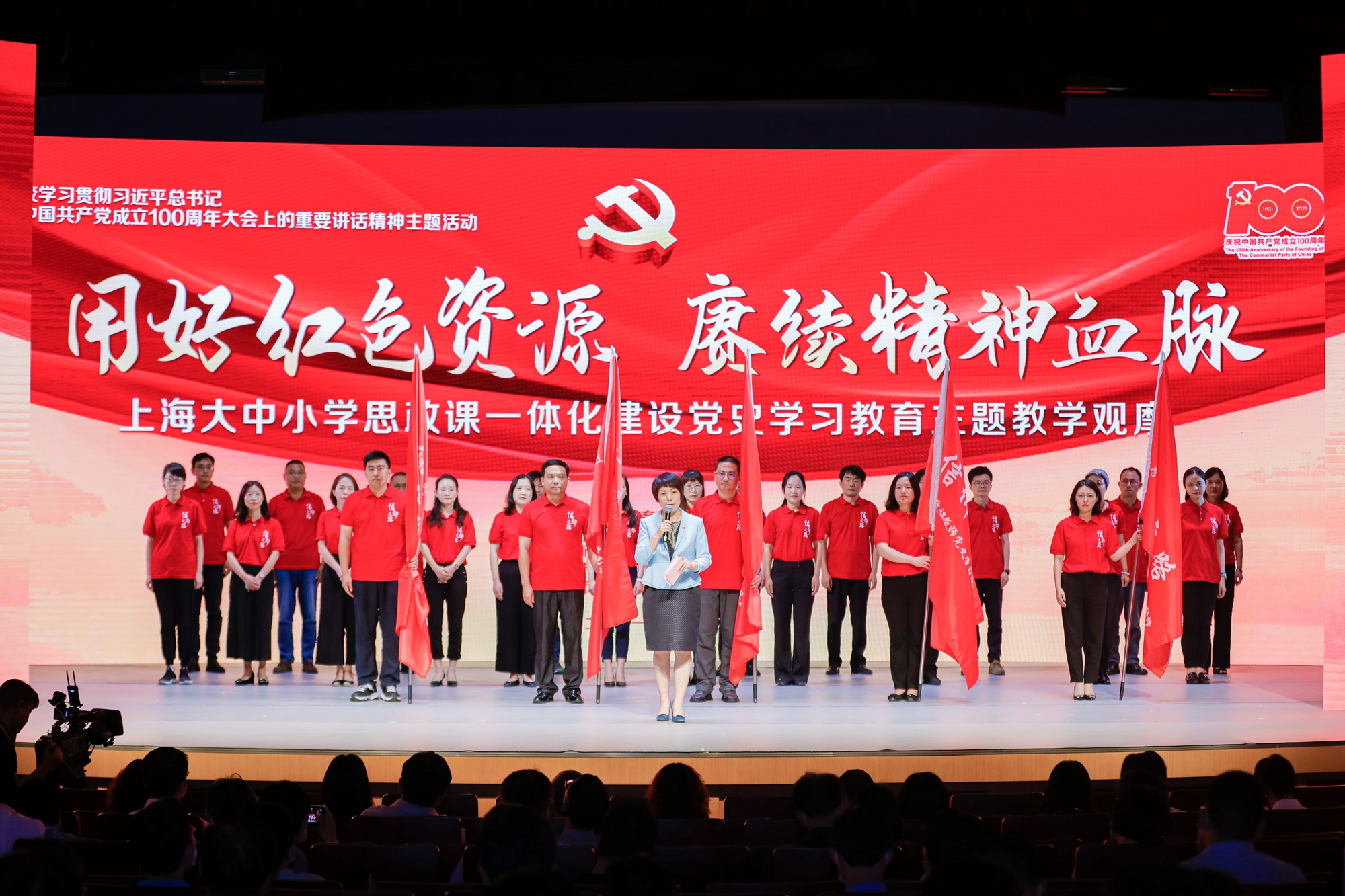 历史川流不息,精神代代相传。为了用好红色资源,助力思政课教师讲好百年党史,上好“大思政课”,活动现场还启动了上海“信仰之路——上海学校思政课教师党史学习教育实践研修”。教育部社科司司长徐青森、副司长宋凌云,上海市教卫工作党委书记沈炜,上海市教委主任王平,上海市教卫工作党委副书记、市教委副主任闵辉为参与实践研修的思政课教师代表授旗。