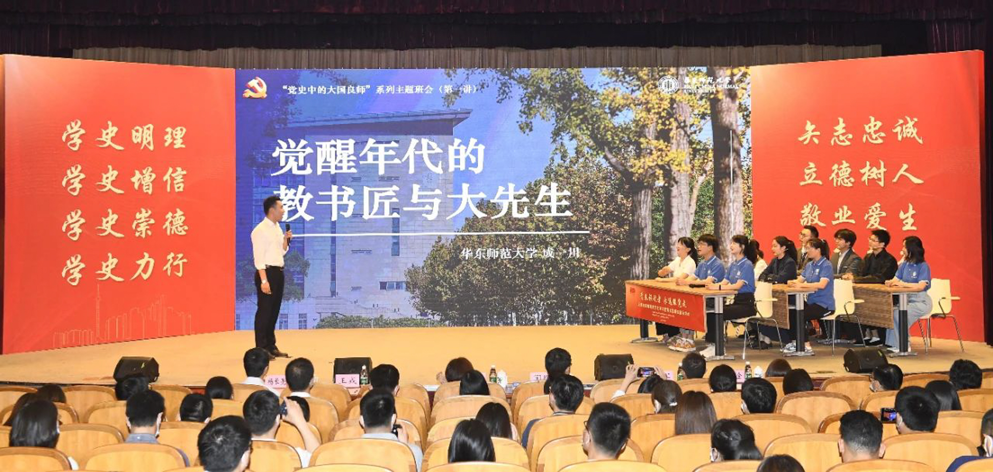 班会结束后,他说:“因大师剧《孟宪承》筹备工作,我进一步学习了华东师大校史、领略了孟宪承生平背后的四史故事;主题班会的小组展示、现场讨论,可以深化同学们对未来教师的身份认同,强化青年人中国共产党的理解。我们有责任、有义务,引导更多的同学们用心体悟党史,崇德力行,将个人发展与党和国家的发展同频共振。”