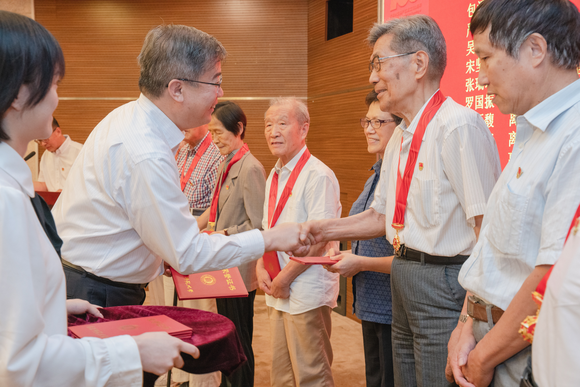 校党委副书记朱民为到场的17位老党员颁发“光荣在党50年”纪念章