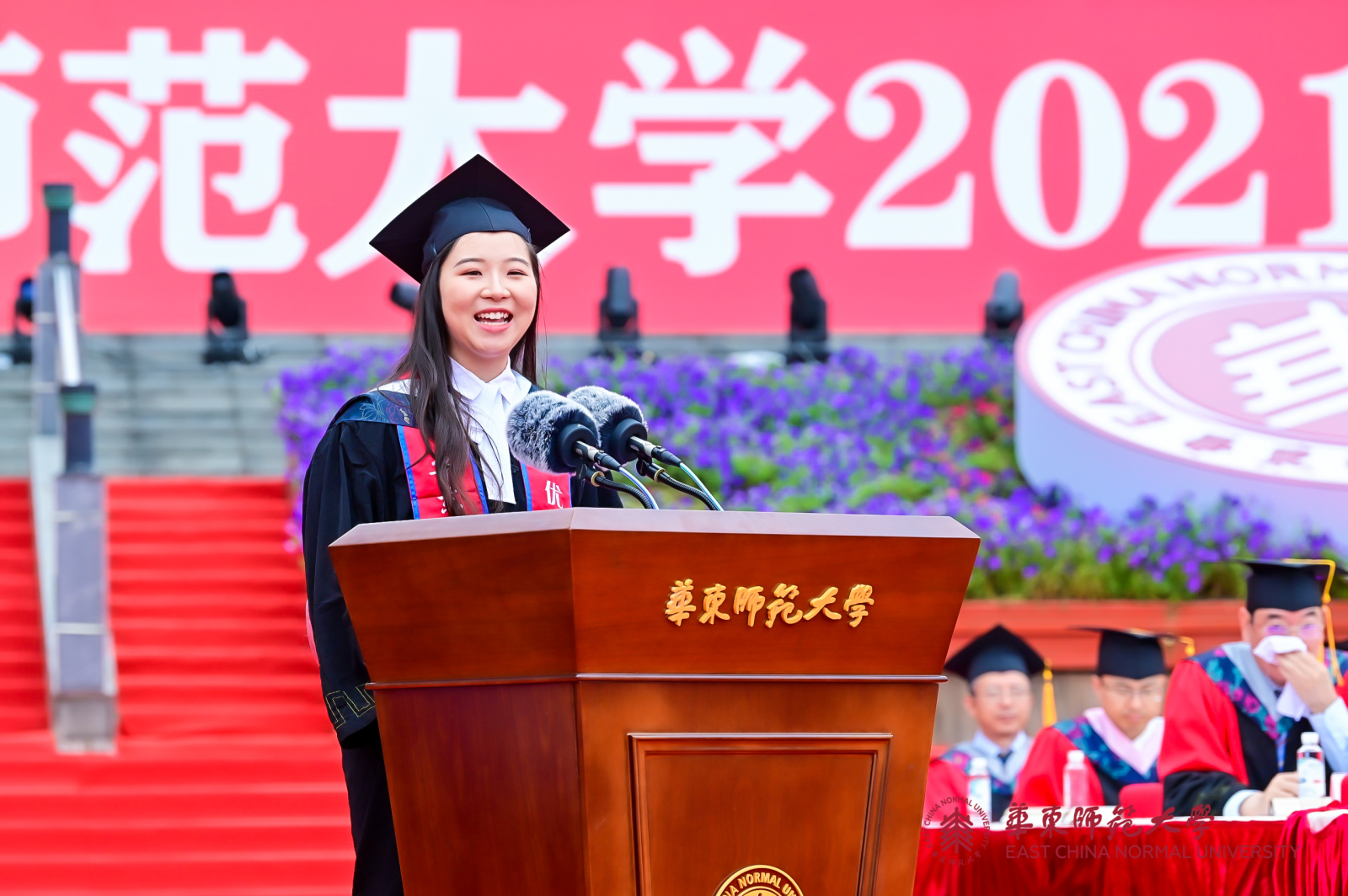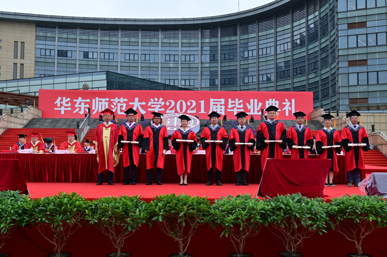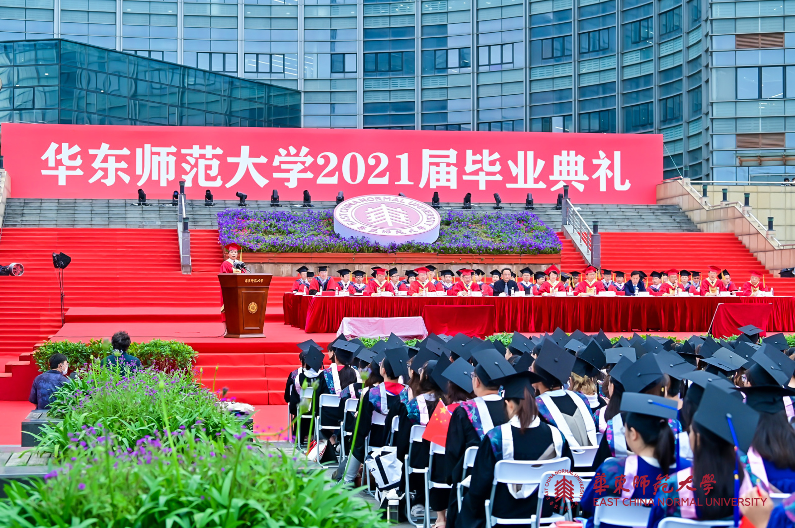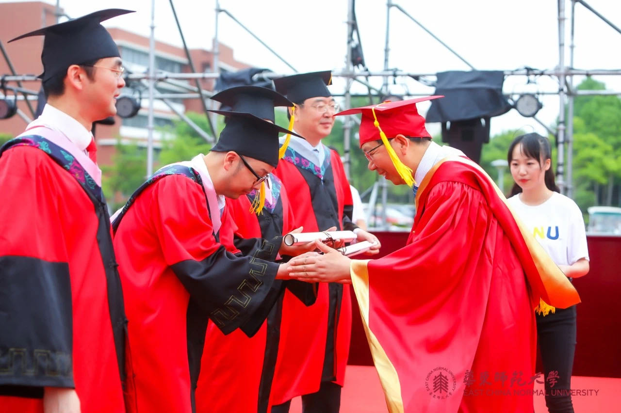 华东师大8000多名毕业生线上线下欢聚一堂。校领导梅兵、钱旭红、朱民、杨昌利、曹友谊、孙真荣、李志斌、周傲英、戴立益,校长助理,校学术委员会和各专门委员会负责人,学部、院系、书院主要负责人,校友代表,教师代表,毕业班辅导员,相关职能部门负责人等出席典礼,一起见证了师大学子完成学业开启人生新征程的重要时刻。