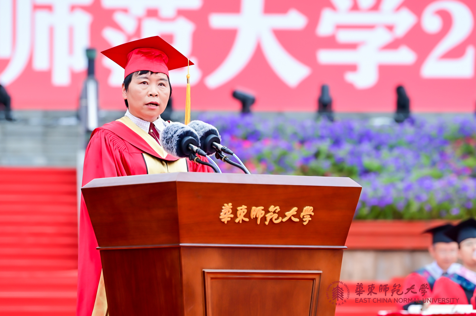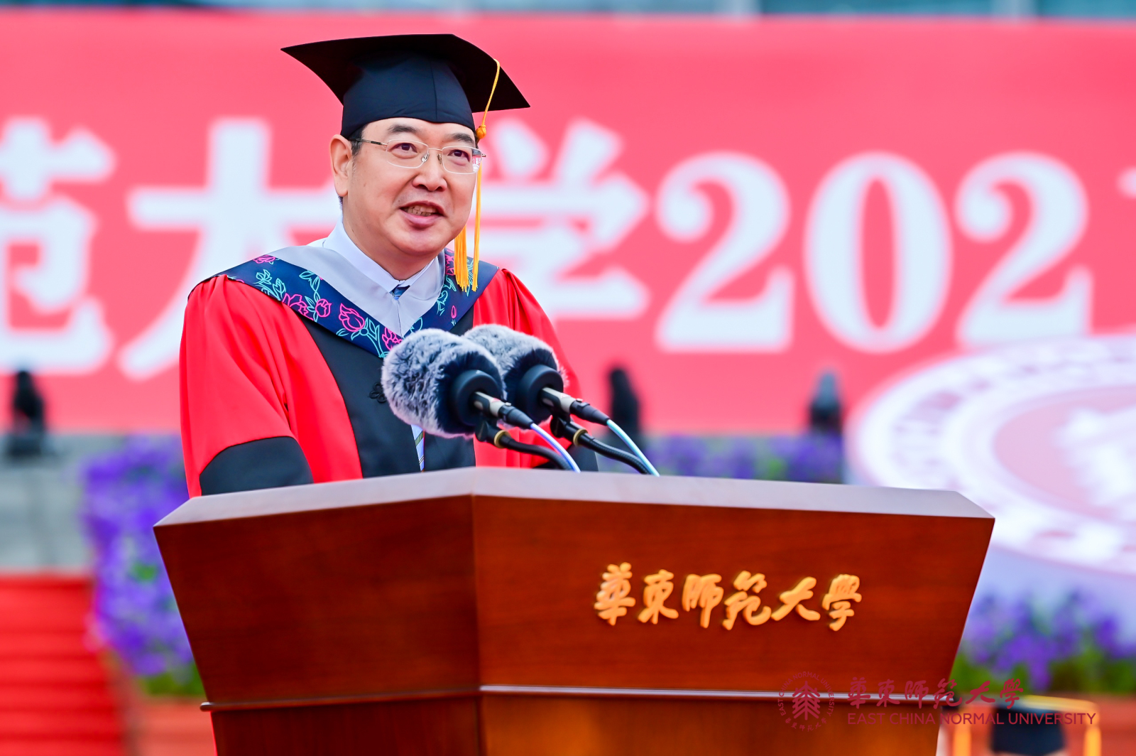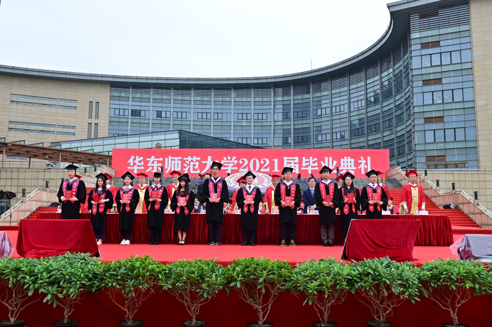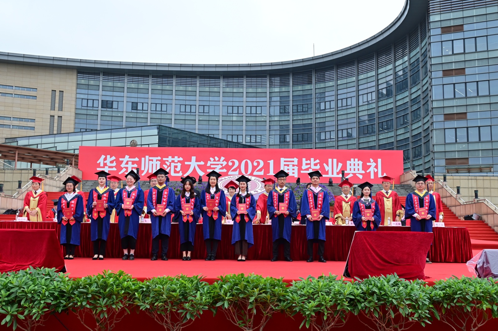 华东师大8000多名毕业生线上线下欢聚一堂。校领导梅兵、钱旭红、朱民、杨昌利、曹友谊、孙真荣、李志斌、周傲英、戴立益,校长助理,校学术委员会和各专门委员会负责人,学部、院系、书院主要负责人,校友代表,教师代表,毕业班辅导员,相关职能部门负责人等出席典礼,一起见证了师大学子完成学业开启人生新征程的重要时刻。